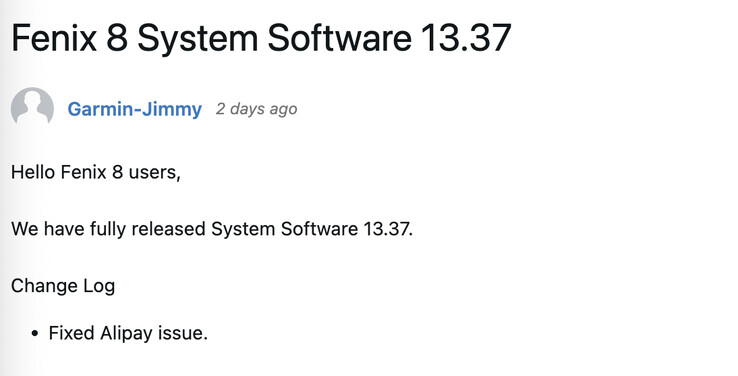在其他设备上,用户通常可以直接查看新更新有哪些改进。出于某种原因,Garmin 决定不在智能手表本身或其 Connect Mobile 应用程序上显示更新日志。相反,Garmin 会在其论坛上发布更新日志,这次终于在系统软件 13.37 中发布了更新日志。结果发现,新更新只是解决了一个未公开的 Bug,该 Bug 导致支付宝无法正常工作。由此看来,Garmin 打算再等几周才为其最新的高端智能手表提供实质性更新。
