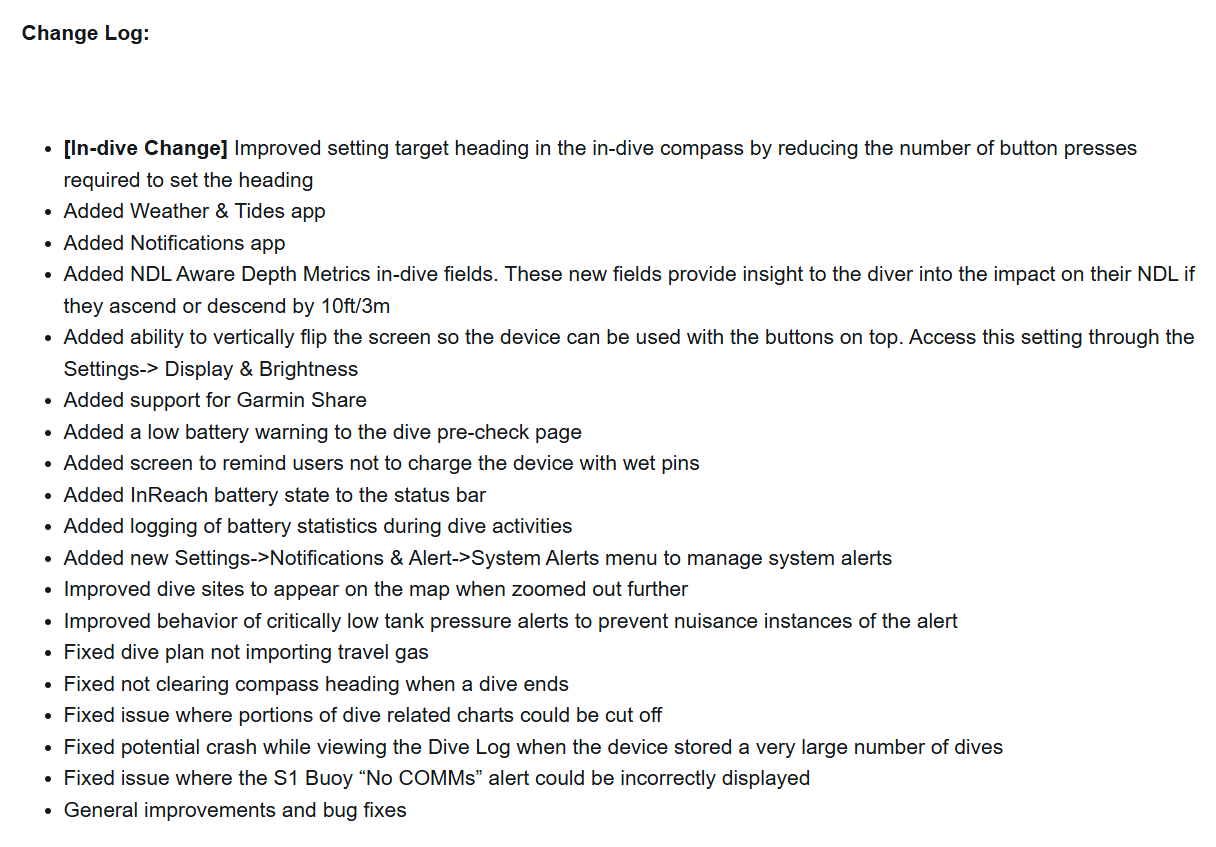 最新更新为这款可穿戴设备添加了天气与潮汐和通知应用程序。该设备现在支持 Garmin Share,用户可以垂直翻转屏幕,将控制按钮的位置从底部切换到顶部。新的 NDL Aware Depth Metrics 潜水字段为潜水员提供了更多洞察力,他们还可以在潜水前检查单上获得低电量警告。此外,状态栏中还可以显示已连接的 inReach 设备的电池电量,并可将电池统计数据记录为潜水活动的一部分。