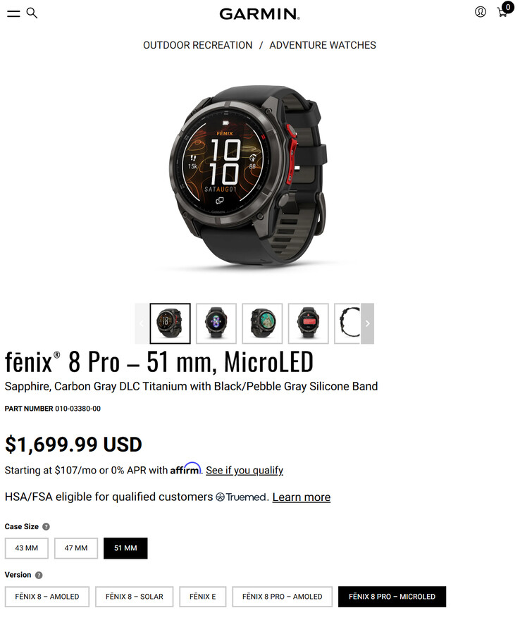 与此同时,Garmin 悄然降低了配备 MicroLED 显示屏的最贵 Fenix 8 Pro SKU 的价格。相反,AMOLED 版本的价格保持不变。因此,Fenix 8 Pro 的起价为 1199.99 美元,51 毫米版本的价格上涨了 100 美元(亚马逊上目前的价格为 1299.99 美元)。