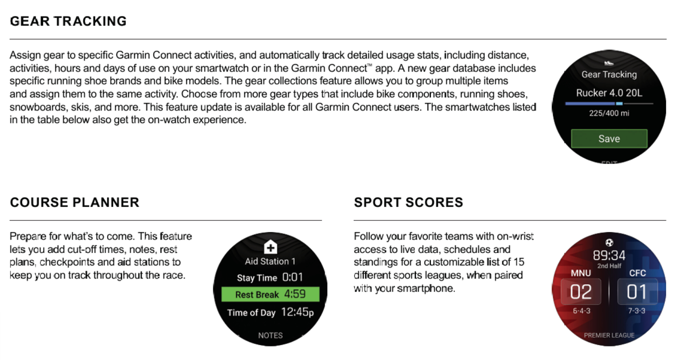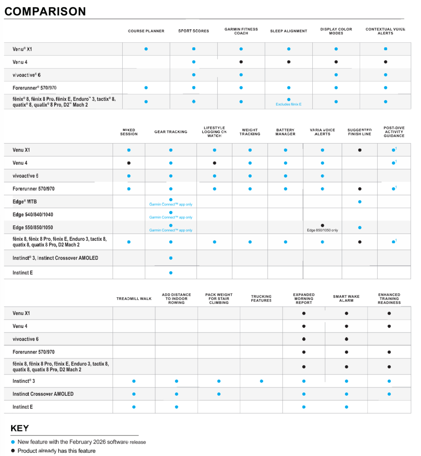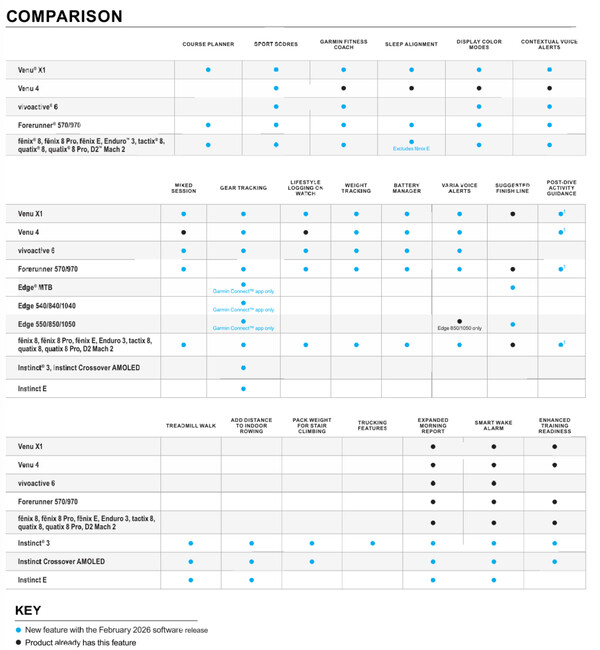 因此,下面的图表和对照表中包含的某些功能可能已经到达某些智能手表。作为参考,Garmin 在 2026 年 2 月的功能更新中包含了以下智能手表: