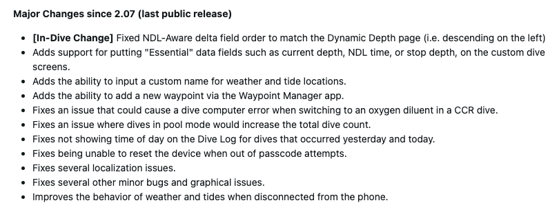 Garmin Descent X30 系统软件 3.06 的发布说明指出,它允许用户在自定义潜水屏幕上添加基本数据字段,如当前深度、NDL 时间和停止深度。与天气和潮汐信息有关的变化有两个。首先,现在可以为这些位置添加自定义名称。其次,据说这些功能在可穿戴设备未与手机连接时的表现也得到了改进。