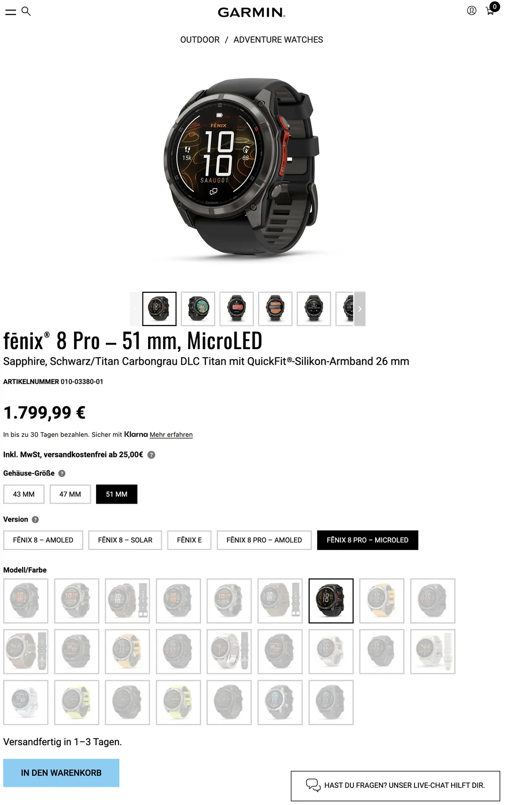 一个月后,该公司在欧洲也悄然降低了其唯一一款 MicroLED 智能手表的价格。例如,Garmin Fenix 8 Pro 现在在欧元区的售价为 1799 欧元,而不是去年 9 月发布时的 2099 欧元。因此,MicroLED 版本的售价比 AMOLED 支持的同类产品高出 500 欧元(目前亚马逊售价为 1,199.99 美元)。