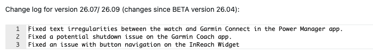除此之外,Fenix 7 测试版 26.09 的更改日志几乎完全相同。它列出了三个错误修复,其中一个解决了 Power Manager 应用程序的一个问题,即手表上的文字与 Garmin Connect 应用程序中显示的文字不一致。在使用 Garmin Coach 应用程序时可能导致这些智能手表关机的问题已经解决,Power Manager 应用程序中手表和 Garmin Connect 之间文本不一致的问题也得到了修复。此外,一个与 InReach Widget 按钮导航相关的错误据说也得到了修复。