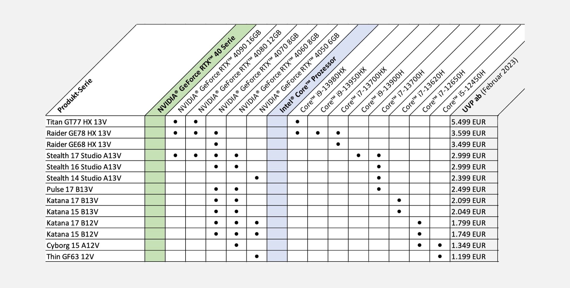 | Raider GE78 HX 13V | GeForce RTX 4090 16 GBRTX 4080 12 GBRTX 4070 8 GB | Core i9-13980HXCore i9-13950HXCore i7-13700HX | € 3,599 | RaiderGE78 HX 13V |