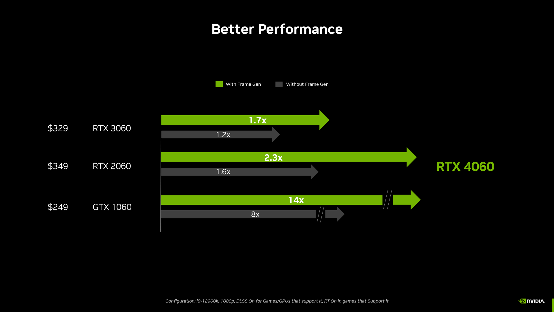 据制造商称,GeForce RTX 4060的性能是GTX 1060的14倍。GeForce GTX 1060.相比之下,新的显卡超过了 GeForce RTX 20602.3倍,而其前辈只有0.7倍。值得注意的是,NVIDIA是在启用DLSS 3框架生成的情况下得出这一数字的,并不代表光栅化的改进。作为参考,停用DLSS 3会使其性能优势下降,超过GeForce GTX 1060的性能优势下降到8倍,而完全取消帧生成技术则将差距缩小到4倍。