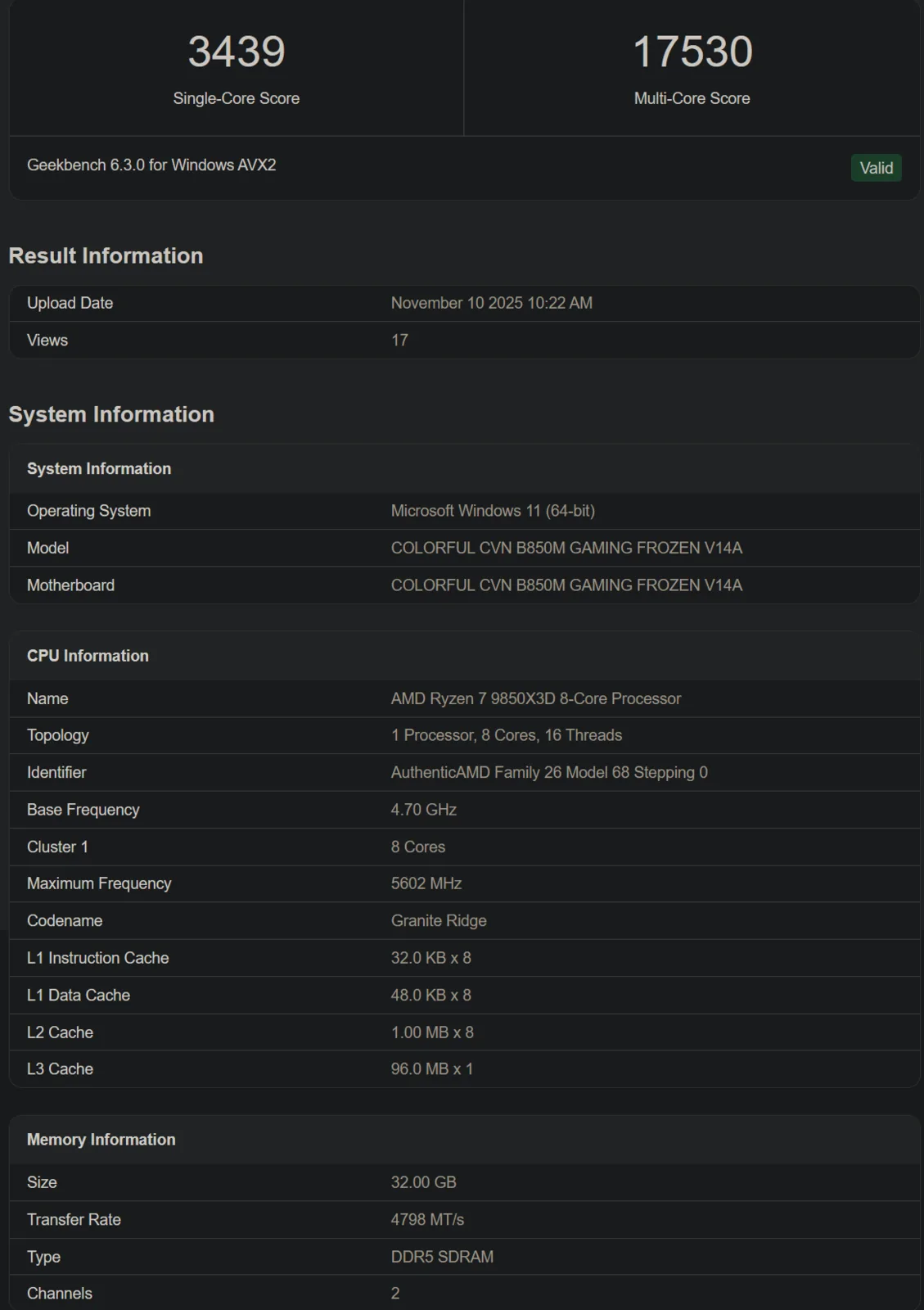 其中一个版本的主频为 5.6GHz,而另一个版本则为 5.4GHz。不过,该芯片在不同的主板上进行了测试,这可能会影响测试结果。在与 Colorful B850M 的首次测试中,Ryzen 7 9850X3D 分别获得了 3439 分和 17530 分,而在第二次测试(铭瑄 B850ITX 主板)中则分别获得了 3260 分和 16149 分。