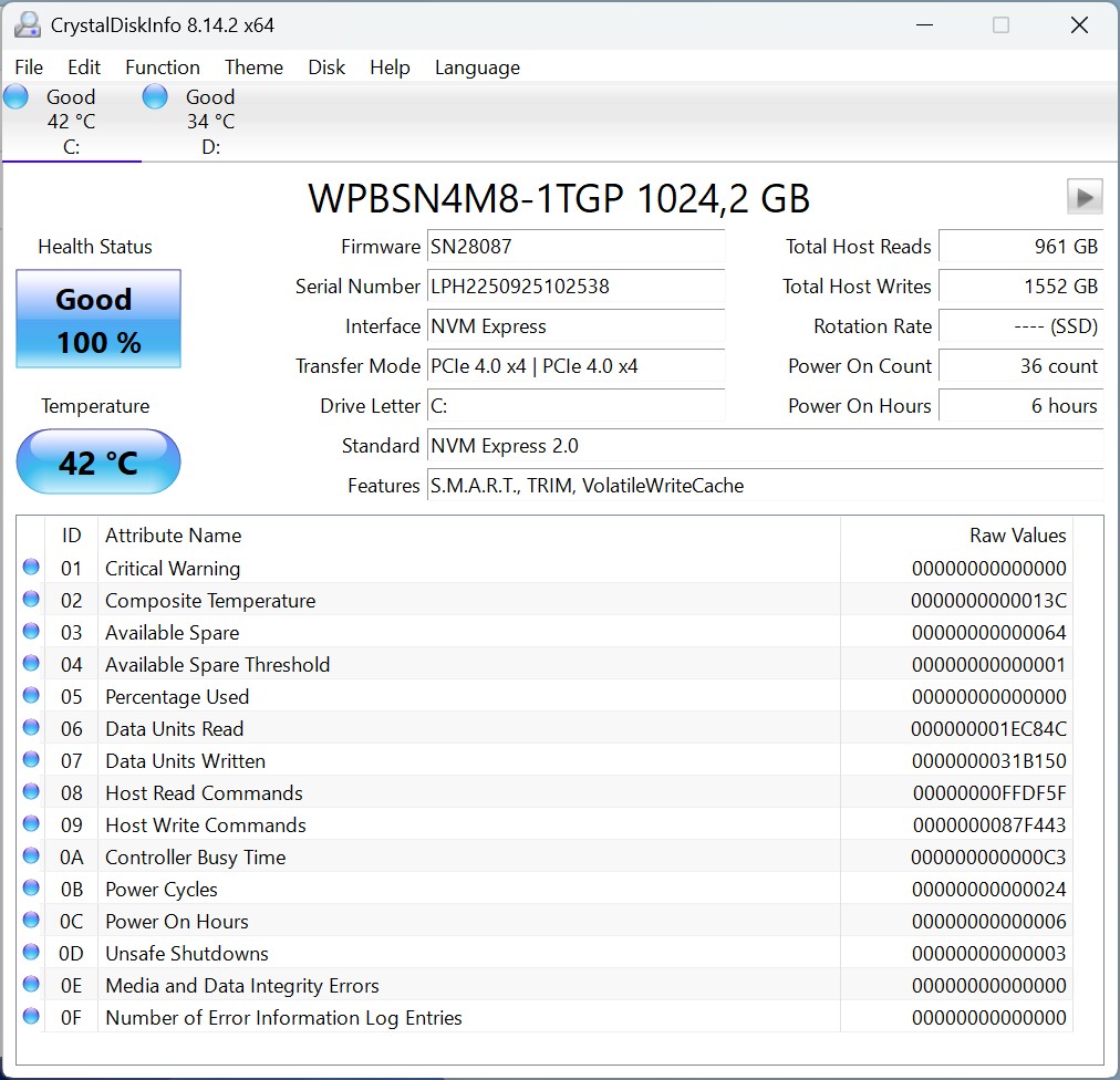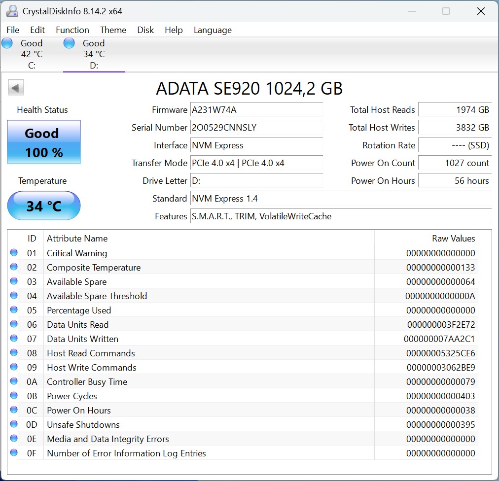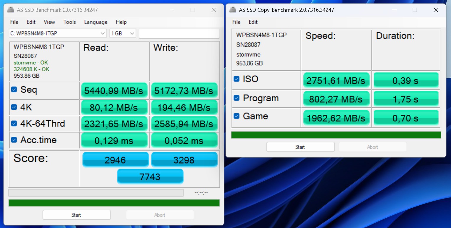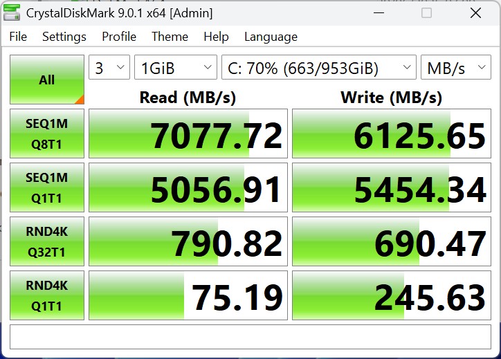 Geekom A7 Max 使用的是 PCIe 4.0 连接的 1 TB 固态硬盘,传输速率还算不错,但并不突出。不过,对于日常任务和生产性工作负载来说,所提供的存储性能已经足够。硬盘的散热设计使其即使在长时间负载的情况下也能保持稳定的性能。