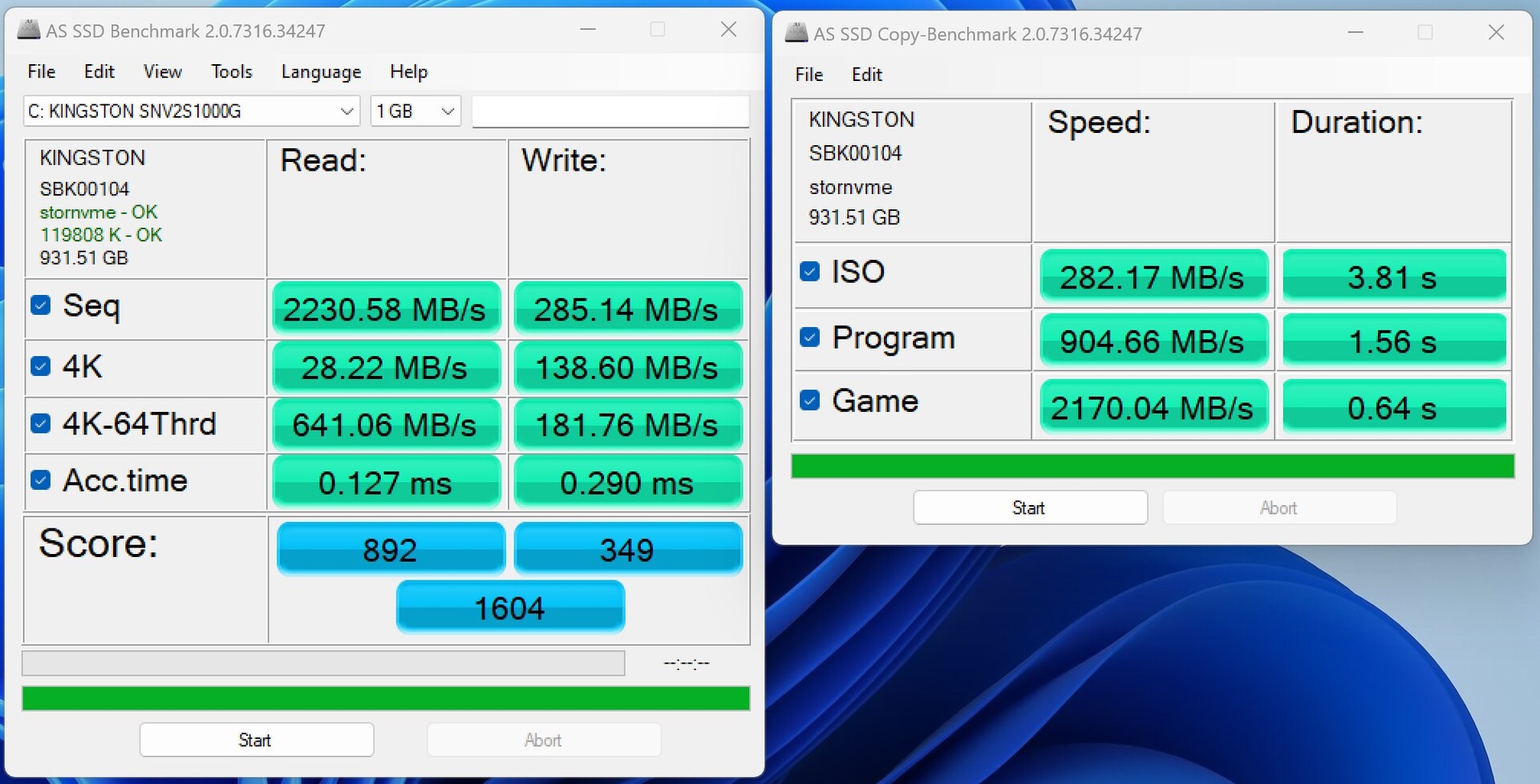 Geekom为AS 5配备了金士顿1024GB NVMe SSD。安装的模型使用NVMe接口,应该能提供相应的传输速率。在读取速度方面,我们观察到坚实的性能,尽管写入速度非常糟糕。为了排除这是Geekom AS 5的问题,我们还在另一台迷你PC上测试了金士顿NV2。然而,性能并没有明显提高。作为比较,我们还为Geekom AS 5配备了金士顿KC3000。这导致了更好的传输率,并清楚地表明问题不在于我们的审查设备,而在于金士顿NV2。