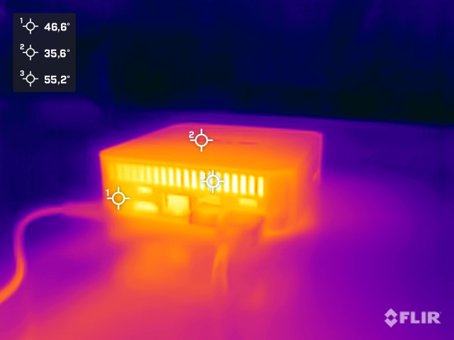 在散热方面,Geekom GT13 Pro 的设计非常有限。不过,这款迷你电脑在空载时仍然非常安静,尽管在负载情况下可以清晰地听到小风扇的声音。在测试中,我们测得的最大声压级为 48.5 dB(A)。只要达到 PL2 值,GT13 Pro 就能在短时间内达到这一噪音水平。在长时间负载的情况下,SoC 会以 PL1 的极限值工作,这意味着音量会在 39 dB(A) 左右趋于平稳。如果没有永久负载,例如我们用 Prime95 模拟的情况,风扇会非常紧张地工作。在我们的测试样本中,平均负载下的声压级在 38 到 44 dB(A) 之间波动。
