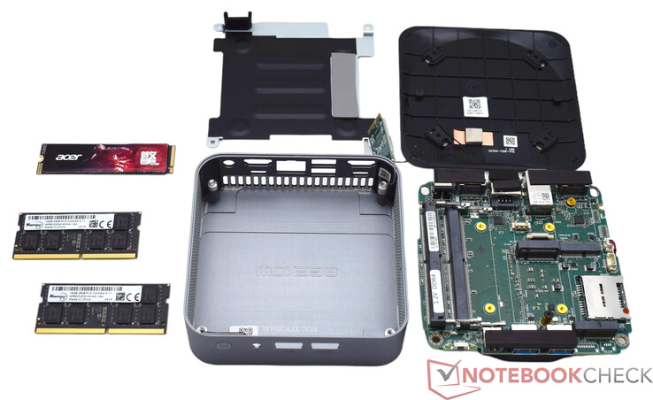 Geekom GT13 Pro 始终与内存和固态硬盘一起销售。这意味着不必像裸机那样,必须打开设备才能安装缺少的硬件组件。如果还需要进入内部,可以从底部打开 Geekom GT13 Pro。胶粘的橡胶脚垫下隐藏着四颗螺丝,用于固定塑料盖。这里要小心,以免损坏 WLAN 天线线缆。塑料盖下还有一块金属板,如果要访问固态硬盘或内存,也需要将其取下。WLAN 模块也可以更换。要访问冷却装置(制造商宣传为 IceBlast 1.5),必须将电路板从外壳中完全拆下,这在实际操作中并非难事。