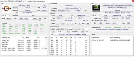 在我们已经测试了不到1800欧元(约1788美元)的A5 X1与 Ryzen 9 5900HX和 GeForce RTX 3070现在,技嘉给我们送来了便宜得多的A5 K1,它也有16GB DDR4内存(2x 8GB双通道)和512GB基于NVM的固态硬盘,但不得不用较少的CPU和GPU功率来做。然而,一个Ryzen 5 5600H和一个 GeForce RTX 3060在900欧元左右(约894美元)是非常可敬的。在这个价格范围内,你通常只能得到一个 GeForce RTX 3050或 3050 Ti.技嘉(或裸机制造商Clevo)使用1920 x 1080像素的哑光144赫兹面板作为显示器。请注意。这台电脑实际上只配备了FreeDOS。不过,技嘉很好地提前为我们安装了Windows 11 Pro。