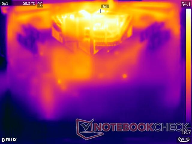 (-) The maximum temperature on the upper side is 52.6 °C / 127 F, compared to the average of 40.4 °C / 105 F, ranging from 21.2 to 68.8 °C for the class Gaming.