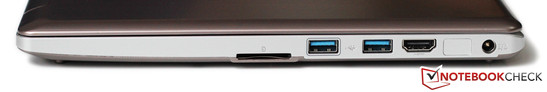 Like many other notebooks of 2012, the Gigabyte U2442N has two USB 3.0 interfaces. In addition, the laptop offers two USB 2.0 ports and this should satisfy most users. It is a real pity that the test model lacks a (Mini-) DisplayPort interface, but the user is provided with both a VGA and a HDMI interface.