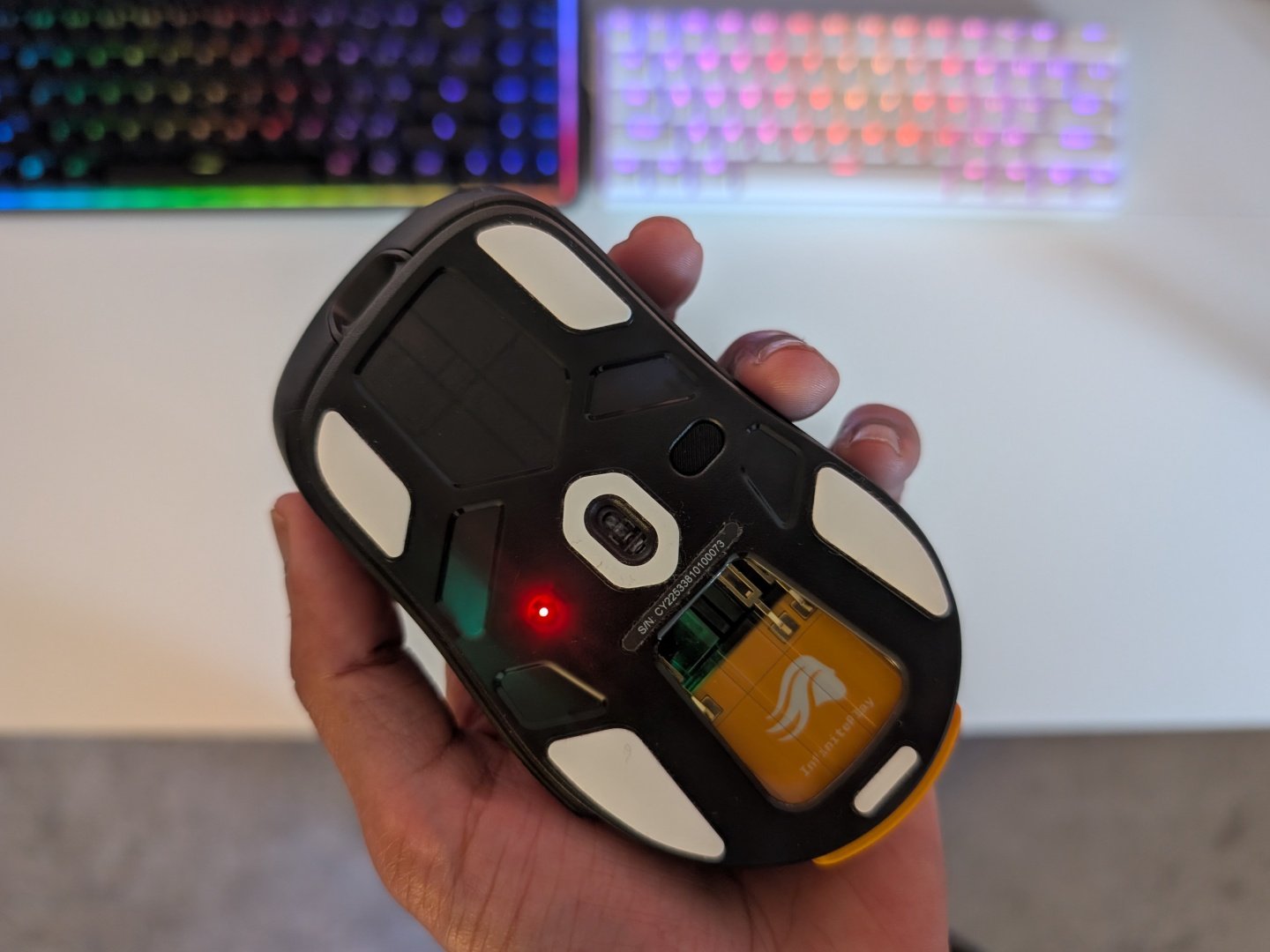 光荣的 V3 鼠标采用了黑/白+橙的配色方案,我们这次评测的是黑色款。这意味着即使关闭了 RGB 功能,鼠标上也会有一些颜色,因为从背面可以看到可更换的电池。鼠标侧面有两个按钮,顶部有一个 DPI 按钮,位于滚轮后面。按键和主体之间有一个半透明的缝隙,RGB 灯光就是从这个缝隙中透射出来的。可更换电池从后部插入,卡入到位,按一下即可松开。底部是 100% 聚四氟乙烯脚垫以及电源和模式开关组合按钮。