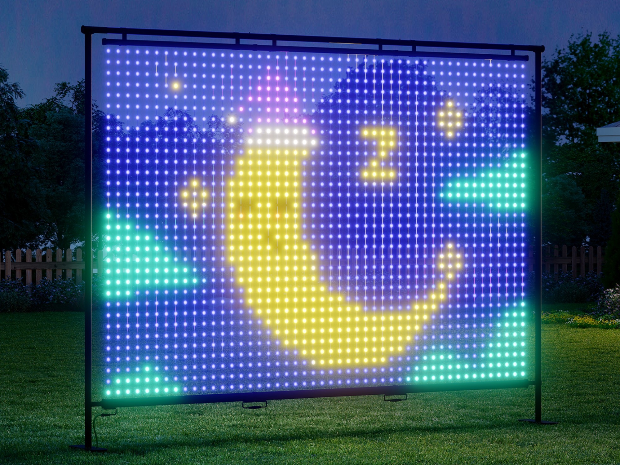 Govee Lightwall 将 1,536 个 RGBIC LED 装入精确的 32×48 像素网格中,像素间距仅为 1.96 英寸,是同类产品中密度最高的。因此,无论是在院子里显示完整的场景,还是在近距离展示复杂的细节,都能呈现出异常清晰的图像和无缝的色彩渐变。在 35 FPS 电影级帧速率的支持下,动态效果保持流畅、无延迟,使复杂的动画栩栩如生,动作流畅自然。