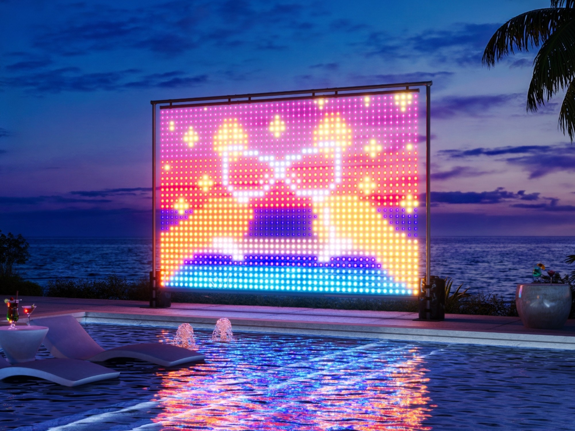 这款壁灯有 1,536 颗 LED 灯珠。 壁灯尺寸为 7.9 × 5.3 英尺(不含框架)。与其他灯具不同的是,该显示屏可在不同地点之间快速移动。它体积小巧,可装入手提袋,还配有一个可拆卸的铝制框架,用于支撑帆布。