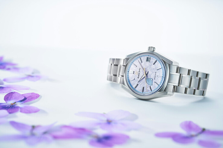色调参考了 "Sumire"(紫罗兰)花。表盘采用柔和的紫灰色调,搭配蓝色动力储备指示器和蓝色周边环。由于采用了金色元素,包括 GS 徽标和秒针,与纹理丰富的 "Hana-ikada "图案形成鲜明对比,该图案旨在模仿漂浮在水面上的樱花。