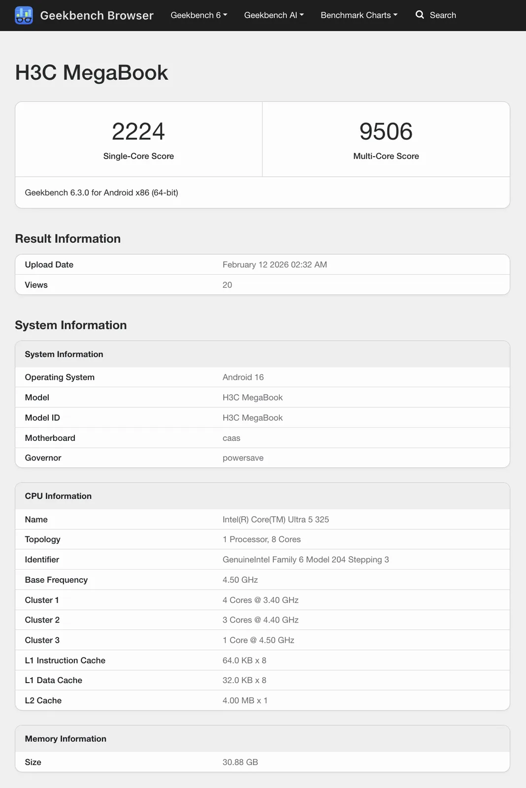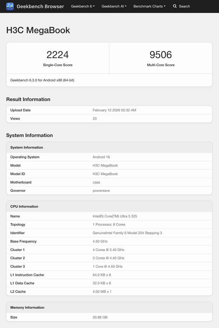 现在看来,去年 H3C MegaBook 基于 Panther Lake 技术的后继机即将面世。在官方资料中,我们还找不到 H3C 提及新版 MegaBook 的信息。不过,Geekbench 上有大量 H3C MegaBook 采用英特尔 Core Ultra 5 325处理器。与高达 32 GB 的 RAM 搭配使用的是 酷睿至尊 5 325配备 4 个 P 核心和 4 个低功耗核心,峰值时钟频率分别为 4.5 GHz 和 3.4 GHz。