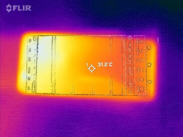 (+) In idle usage, the average temperature for the upper side is 22.6 °C / 73 F, compared to the device average of 32.9 °C / 91 F.