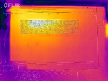 那么废热呢?单风扇--尤其是它经常静止不动--能保持机箱的温度吗?它在空转时可以,因为APU产生的废热很少,所以顶部和底部的平均温度保持在30度以下。在轻度负载和压力测试过程中,EliteBook变得不那么温热了。正如之前在 "性能 "部分所显示的,APU只能将功率从50瓦调节到41瓦,然后单个风扇必须将这41瓦推到机箱外。它只是艰难地做到了这一点;我们在某些地方测量了49和57度(顶部/底部)。键盘上方的条状区域几乎感觉很热。我们还在小型电源适配器上登记了56度。