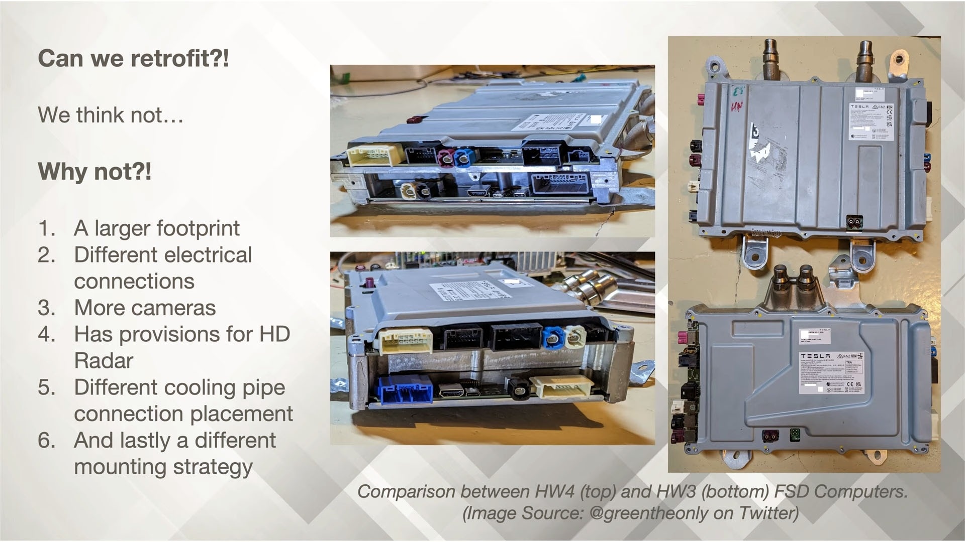 对于那些购买了 FSD 但现在发现自己的汽车无法运行有史以来最令人兴奋的 FSD 更新的 HW3 车主来说,特斯拉正在悬赏两枚胡萝卜。购买了 FSD 的车主可以以折扣价换购 AI4 车辆,或者选择更换电脑和摄像头套件。更换 改装本身就不是一件小事,因为马斯克首次证实,升级必须包括新的摄像头以及功能更强大的 AI4 计算机,这意味着将对车辆进行部分拆卸。