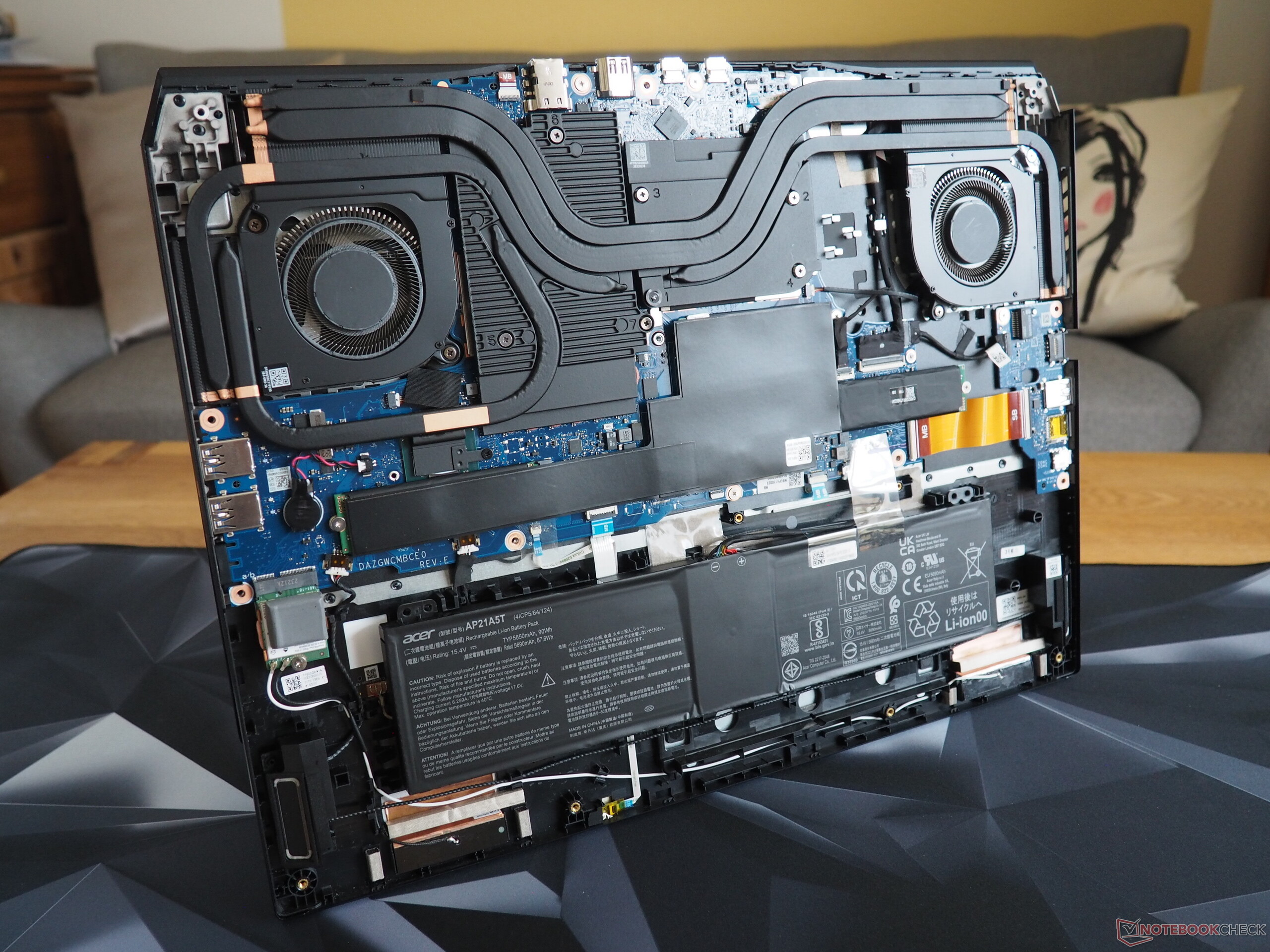 它的维护选项让我们喜忧参半。拧下 14 颗 Torx 螺钉并撬开底板需要花费相当长的时间,此外,宏碁使用的保修封条(覆盖一颗螺钉)甚至可能会吓跑许多用户。在内部,你至少可以接触到冷却系统、电池、无线局域网模块、内存和固态硬盘。不过,后两者都被薄膜和垫子覆盖,更换起来并不方便。