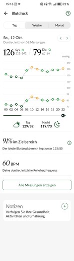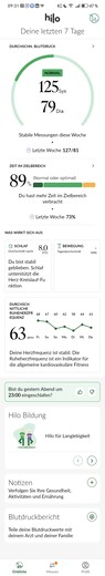经验表明,Hilo Band 每小时测量两到三次血压,然后显示两小时的平均值以及整个测量范围。还可以查看所有单个测量值。测量值可直接分为最佳、正常、升高和过高。附加的颜色编码系统使其非常清晰。体力活动通常意味着在此期间不会记录任何数值。