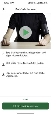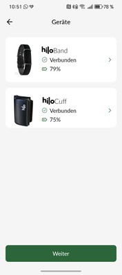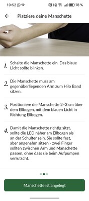 随附的袖带(蓝牙 4.2)可用于此目的,并可在应用程序中轻松配对。一旦应用程序识别到两台设备都已连接,就可以开始校准过程,并一步步引导校准。也可以选择播放视频,再次解释各个步骤。校准是通过连续测量三次来完成的,Hilo 表带戴在较弱的手上,袖带则戴在另一侧。这在评测中没有出现任何问题,而且我们发现设置非常清晰,易于执行,即使是对技术要求不高的人也是如此。