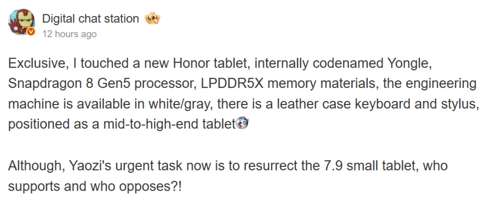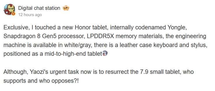 正如下面的截图所示,Digital Chat Station 没有为这款尚未发布的Honor 平板电脑命名。相反,他们提到了它的代号 "永乐"。不过,从芯片组来看,"永乐 "将取代 MagicPad 3 或 Pad GT2 Pro,而不是 MagicPad 3 Pro。具体来说,Honor ,据说 "永乐 "将配备 骁龙 8 代 5的 一加 15R(亚马逊当前售价 699.99 美元)。