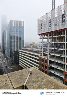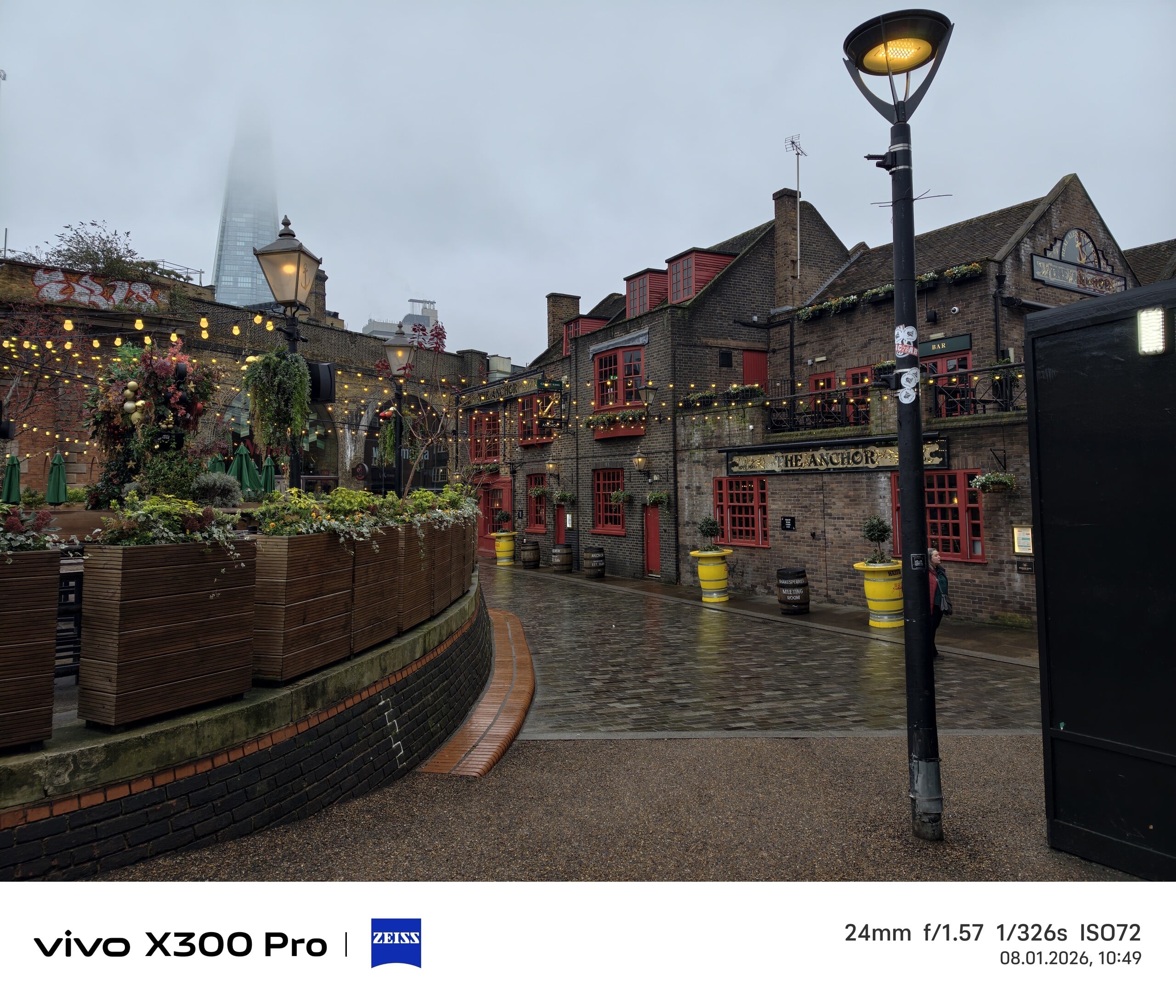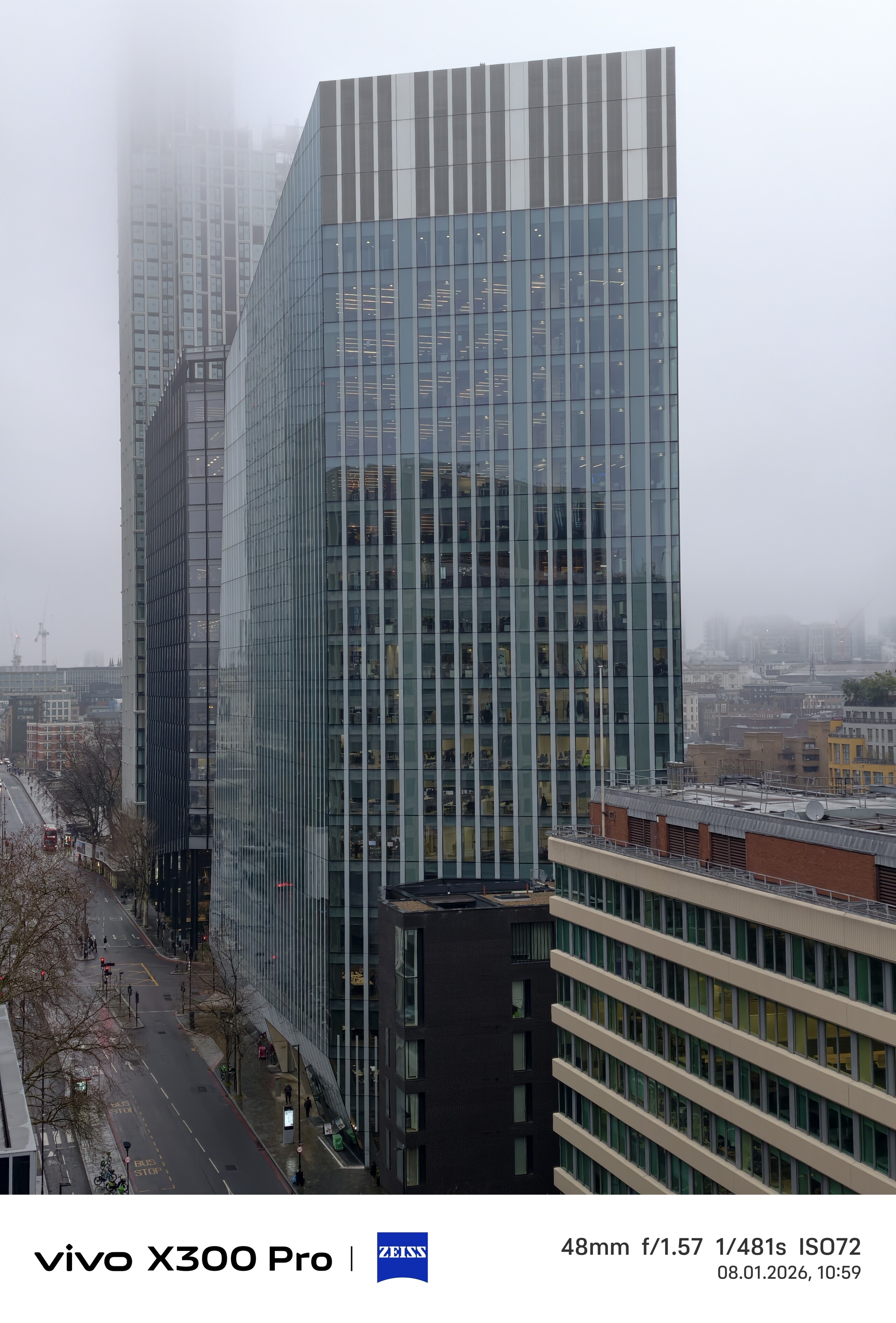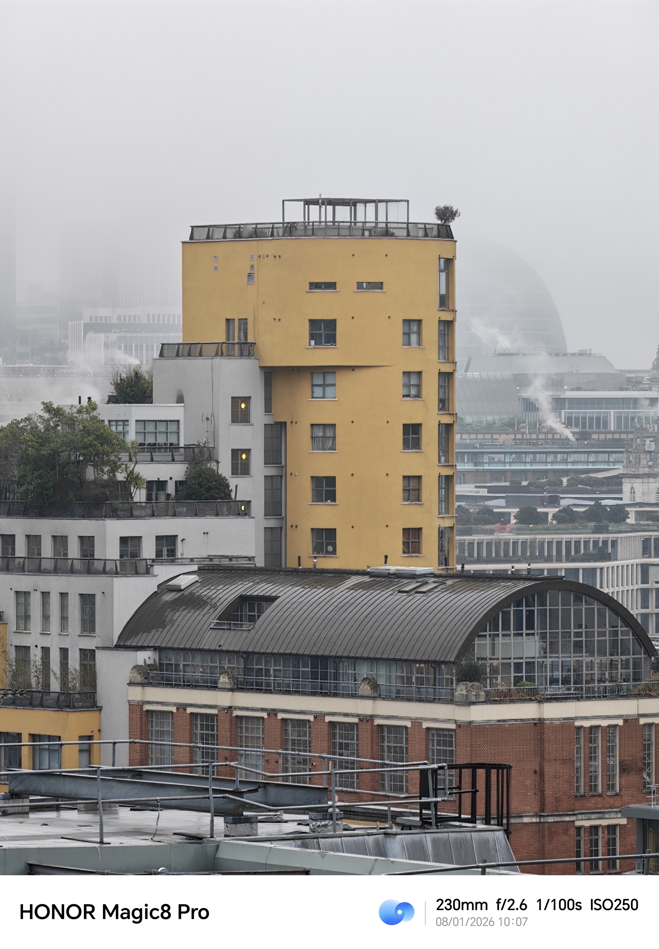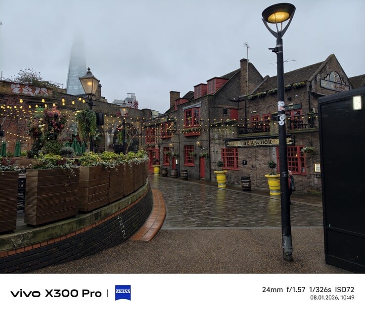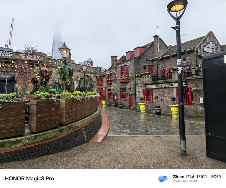 伦敦的天气多云,X300 Pro 的拍摄效果稍好一些,因为图像一般不会变亮。Honor 采用了相反的方法,在整个拍摄过程中对图像进行了大幅增亮,以显示更大的动态范围。在这里,我们希望照片稍微暗一些。遗憾的是,这两款智能手机都只能在专业模式下调整曝光补偿,而且即使这样也不能永久保存。