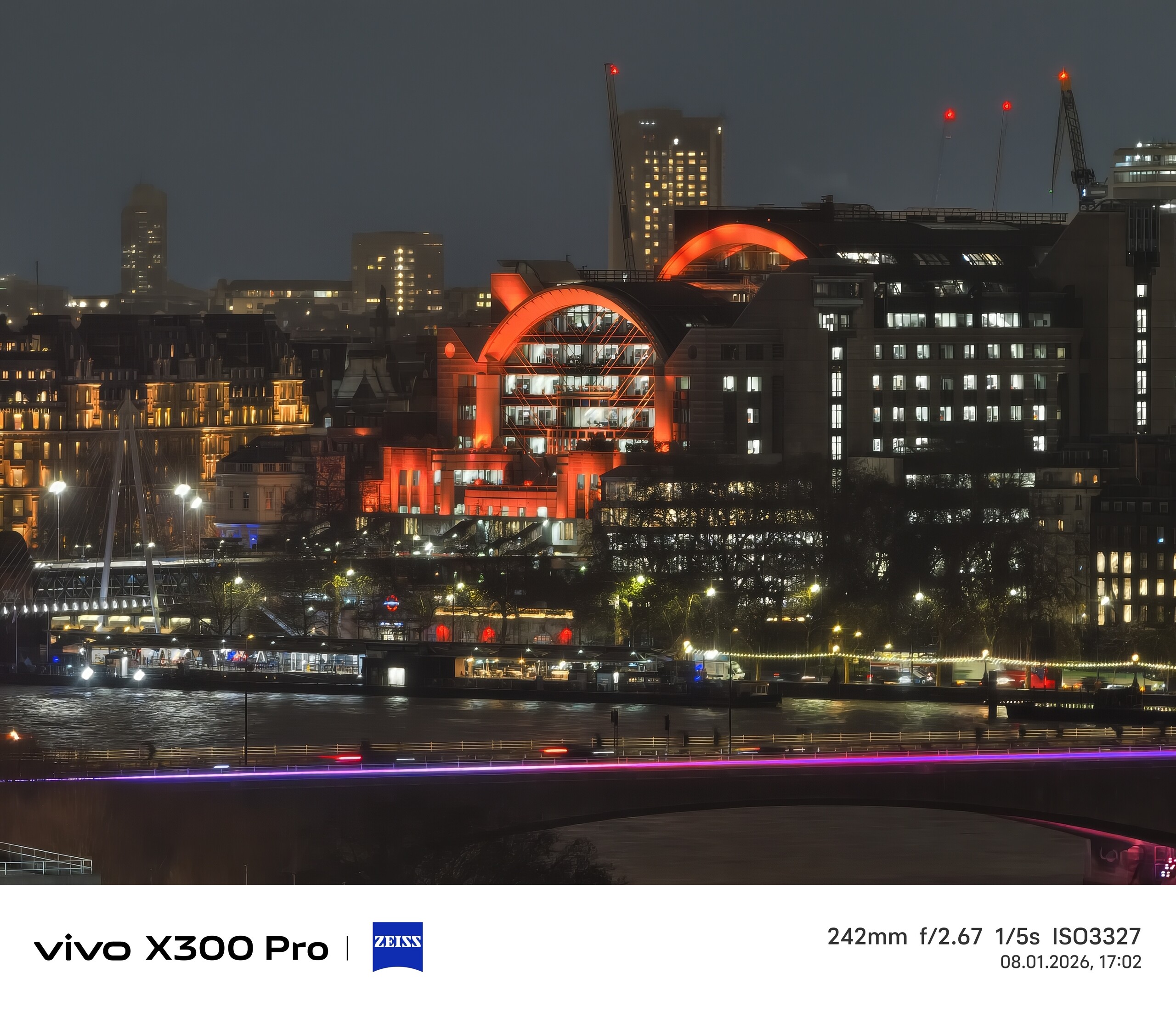 在夜景中,vivo X300 Pro 得益于其感光性更强的硬件,能够提供更好的画质,这一点在海岸边的树木(第 1 张图)或桥栏杆(第 2 张图)等细节上尤为明显。