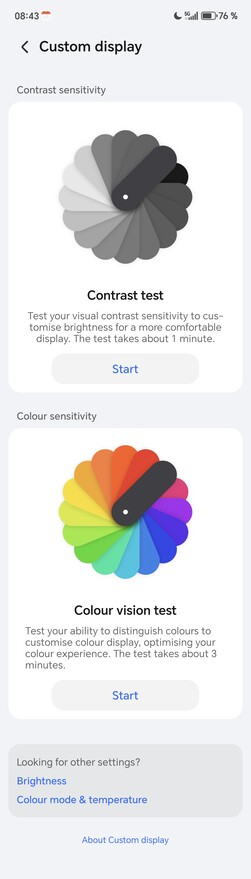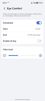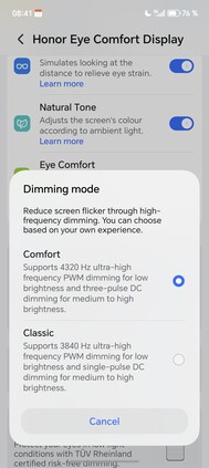 中的中心触点 Honor Magic8 Pro系统的中心点是 "Honor Eye Comfort Display "菜单项,在这里可以直接控制所有附加功能。除了高频 PWM 调光(可在显示屏亮度较低时以 3,840 Hz 和 4,320 Hz 两种频率运行)外,还有 "自然色调 "等常用功能,可根据环境光线调整屏幕色彩。由于减少了蓝光的比例,因此显示效果更温暖。昼夜节律夜间显示 "的工作原理与此类似,旨在减少晚上对睡眠激素的抑制。此外,还有一个可配置的黑暗模式,使显示屏在晚上以较暗的色调显示内容,大多数其他Android 智能手机也提供这种功能。