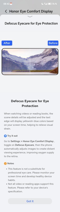 Honor 是最早的 OLED 显示器制造商之一,其 OLED 显示器采用高频 PWM 调光技术,并在其智能手机上一直沿用至今。尽管如此,这还不是最佳显示效果的全部,Honor ,并提供了一个软件包,使其显示屏的设计更加完美,并通过了德国莱茵 TÜV 认证。