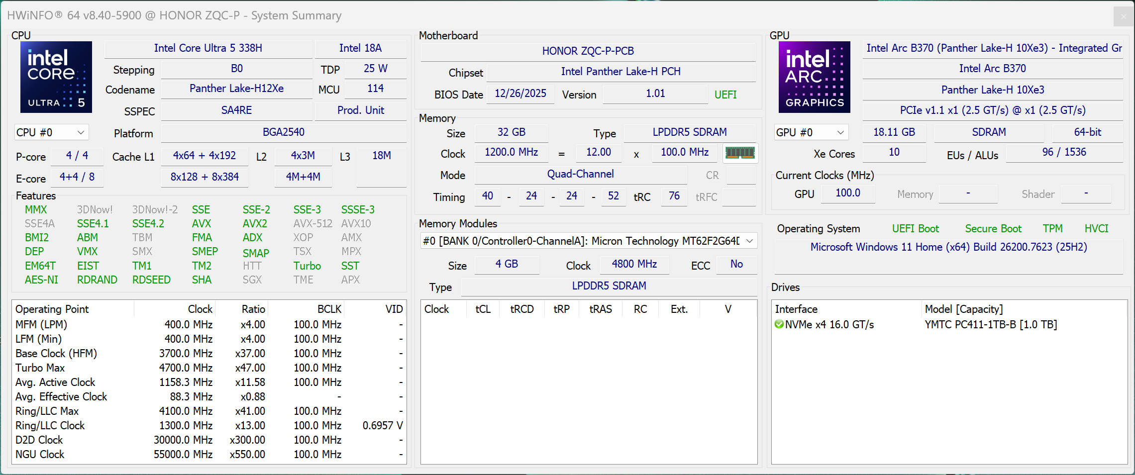 | Honor MagicBook Pro 14 2026 Intel Core Ultra 5 338H ⎘ Intel Arc B370 10 Xe3 Panther Lake iGPU ⎘ 32 GB Memory, 1024 GB SSD | Amazon: | 1.4 kg | 15.9 mm | 14.60" 3120x2080 257 PPI OLED | |