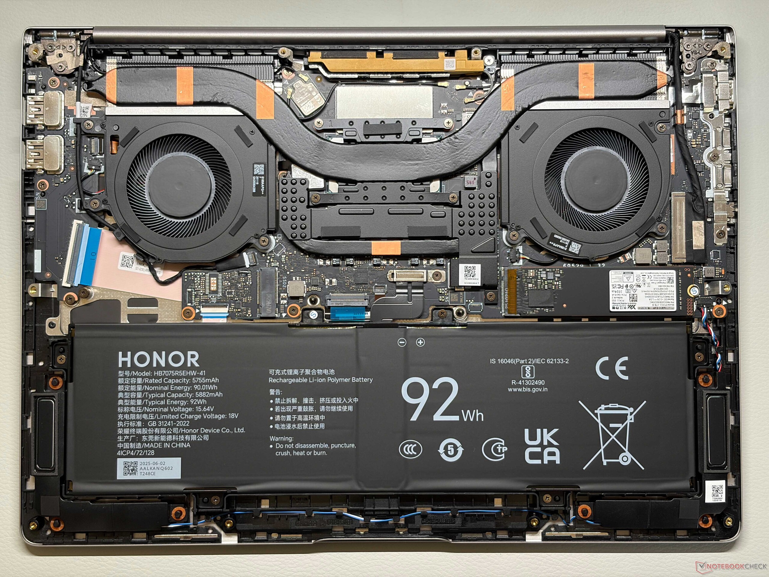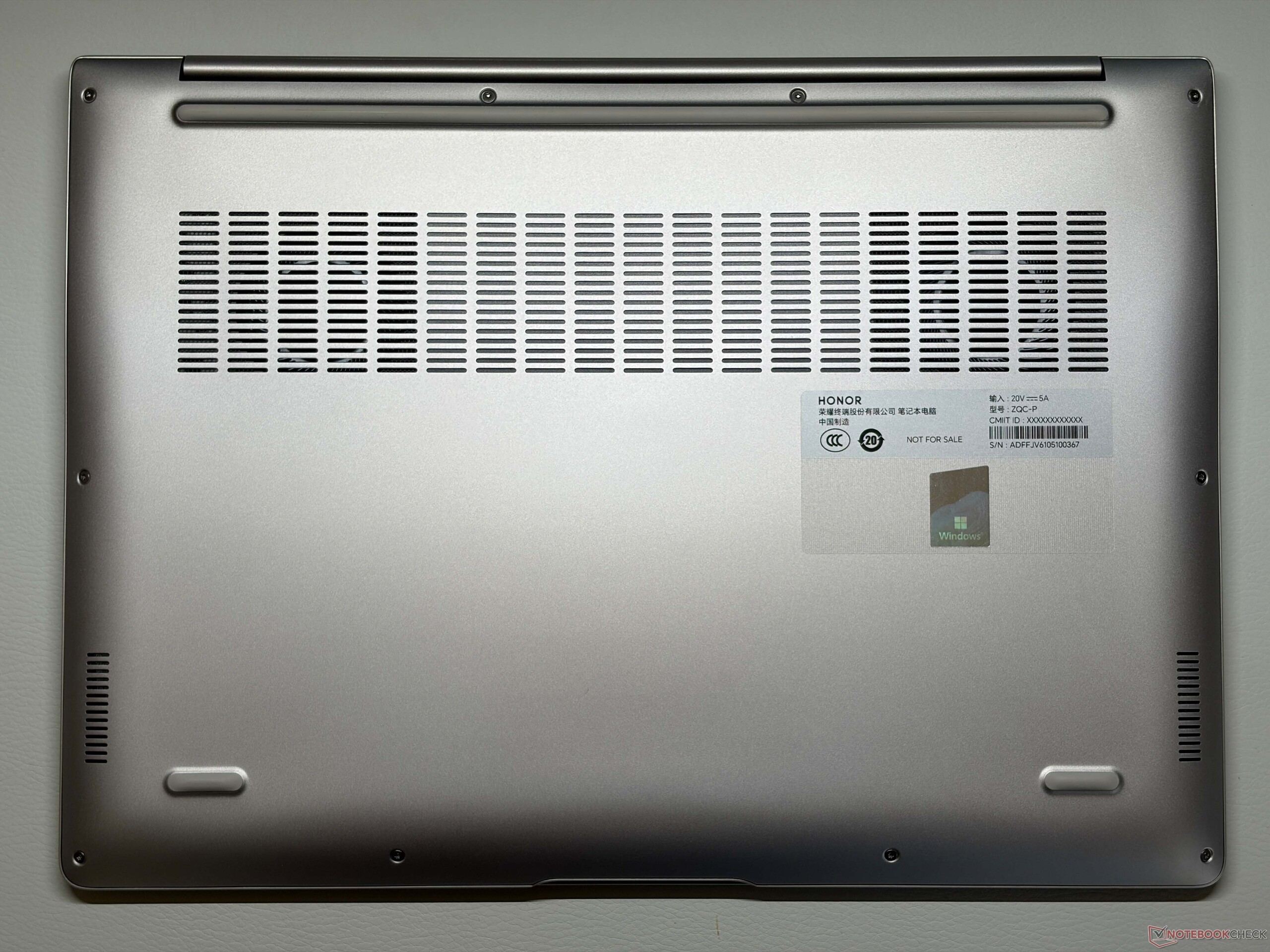 Honor 在新的 2026 机型上,MagicBook Pro 14 依然沿用了上一代产品的机身。金属机身有三种不同的颜色可供选择(星空灰、绿色或白色),质量给人留下了非常好的印象。底座和盖子都非常坚固,铰链调节良好(最大开启角度为 165 度)。单手就能轻松打开盖子,但仍然没有明显的晃动。底部面板很容易拆卸,但维护仅限于风扇、电池和两个固态硬盘插槽。