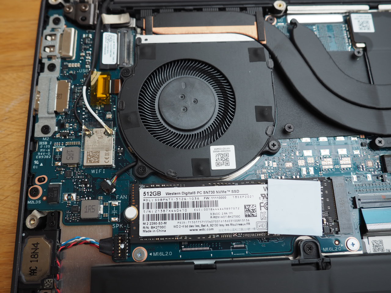 一旦你进入内部,你会看到一个非常整洁的布局。固态硬盘和无线模块,以及电池和冷却系统(双风扇解决方案)都可以使用。另一方面,令人遗憾的是,Honor ,没有选择RAM插槽来扩展内存。集成的16GB是焊接的,当涉及到耐用性和维修时,这不是一个好主意,这对我们来说是一个很大的减分点。