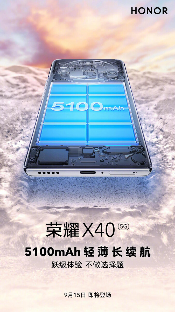 OEM也已经预告了X40的升级版 升级后的5,100mAh的电池,它将被塞进一个薄而轻的框架。这款智能手机将在2022年9月中旬的新闻发布会上首次亮相,现在确认将作为 Honor's2022年秋季中国市场的一般产品活动。