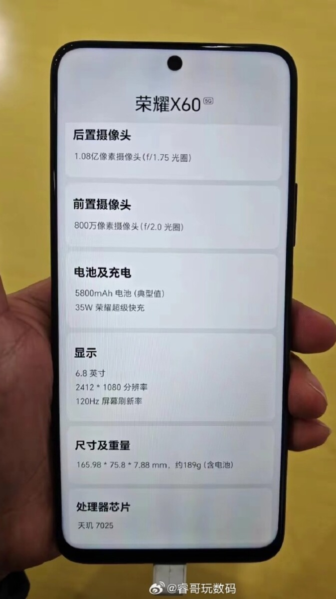 同时,其他泄露的信息表明,Honor ,X60 5G 配备了 6.8 英寸显示屏,这也为巨大的电池提供了足够的空间。具体来说,这款 165.98 x 75.8 毫米的设备据说将依靠一块 5,800 mAh 电池,支持 35 W 有线充电,为 1080p 和 120 Hz 显示屏供电。此外,据传Honor 还为 X60 5G 配备了联发科 Dimensity 7025 芯片组,以及 108 MP 主摄像头、12 GB 内存和 256 GB 存储空间。