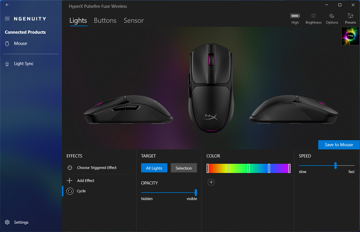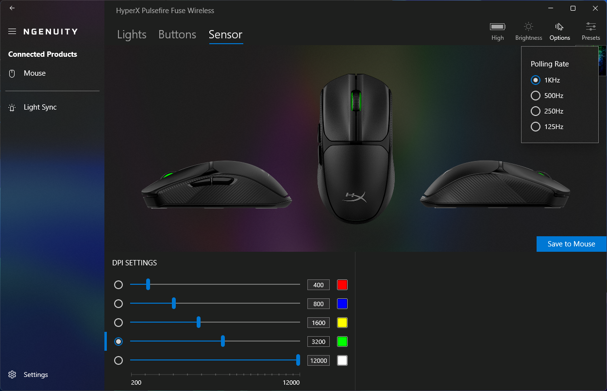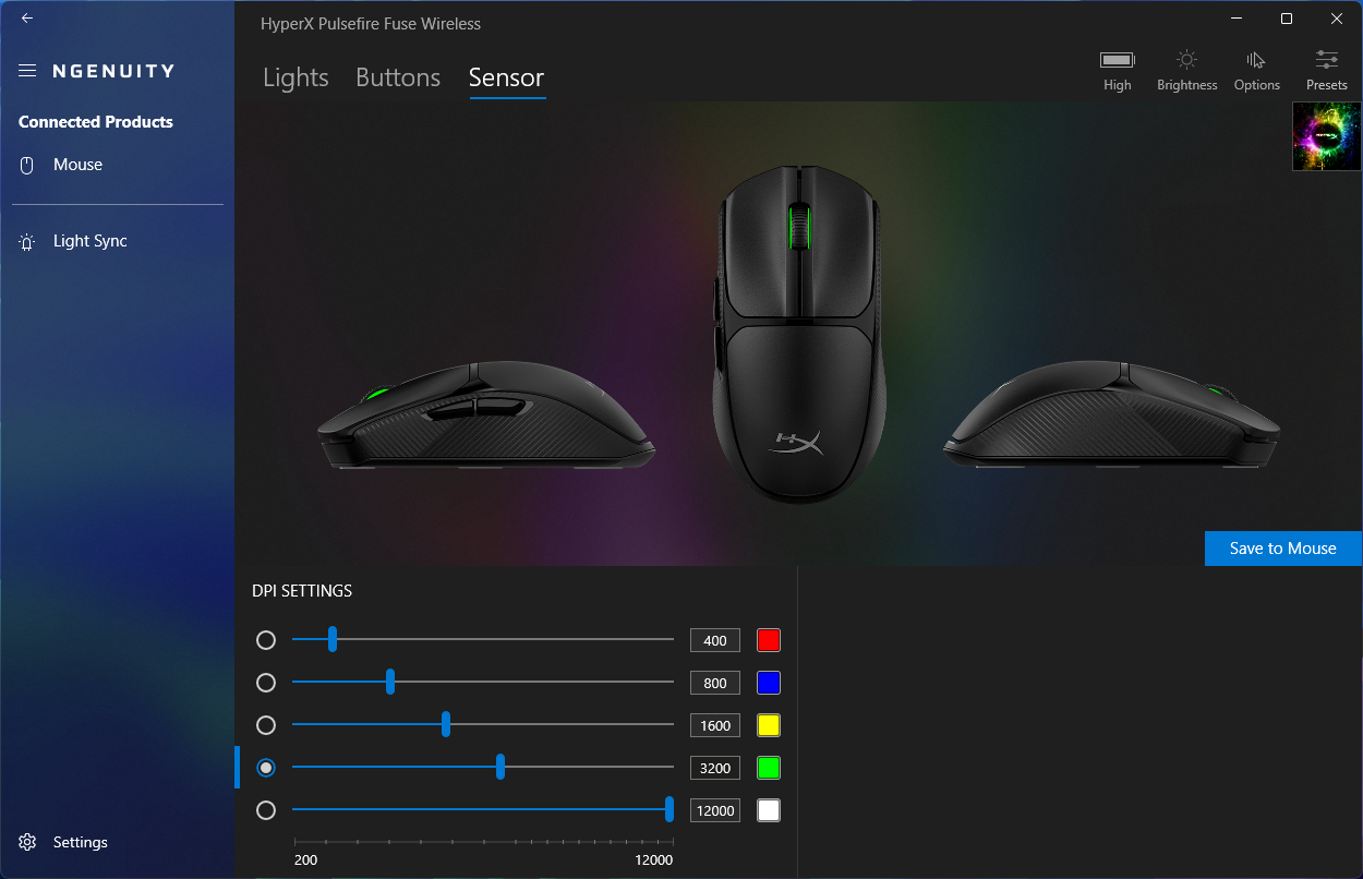 Pulsefire Fuse Wireless 开箱即可使用,无需额外软件。对于需要更多控制的用户,HyperX Ngenuity应用程序提供 RGB 定制、HyperX 设备同步、按钮重映射、轮询率调整、多达五种自定义 DPI 模式和一个板载预设存储空间。