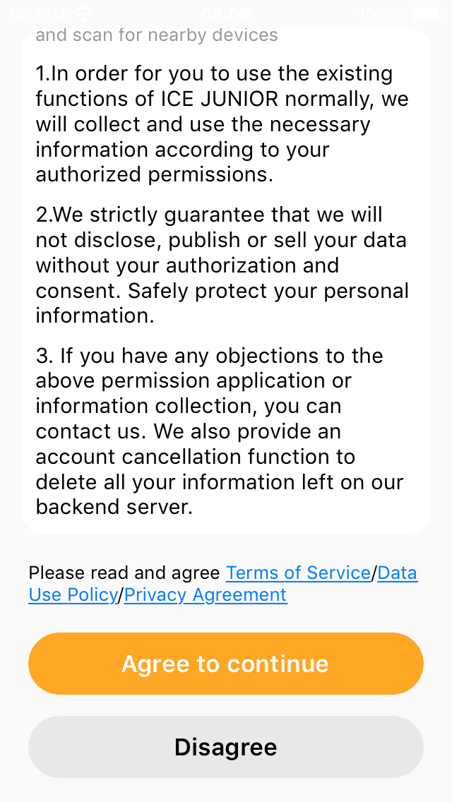 充电时,最好下载 ICE Junior 应用程序(适用于Android 和 iOS),该程序也可在 "访客 "模式下使用。不过,阅读完整的隐私政策后会发现,制造商可能会收集相当数量的数据,有可能将其存储在欧盟以外的地区,并与第三方供应商共享,这对于儿童产品来说并不理想。只要获得所有权限,就可以直接与应用程序配对。