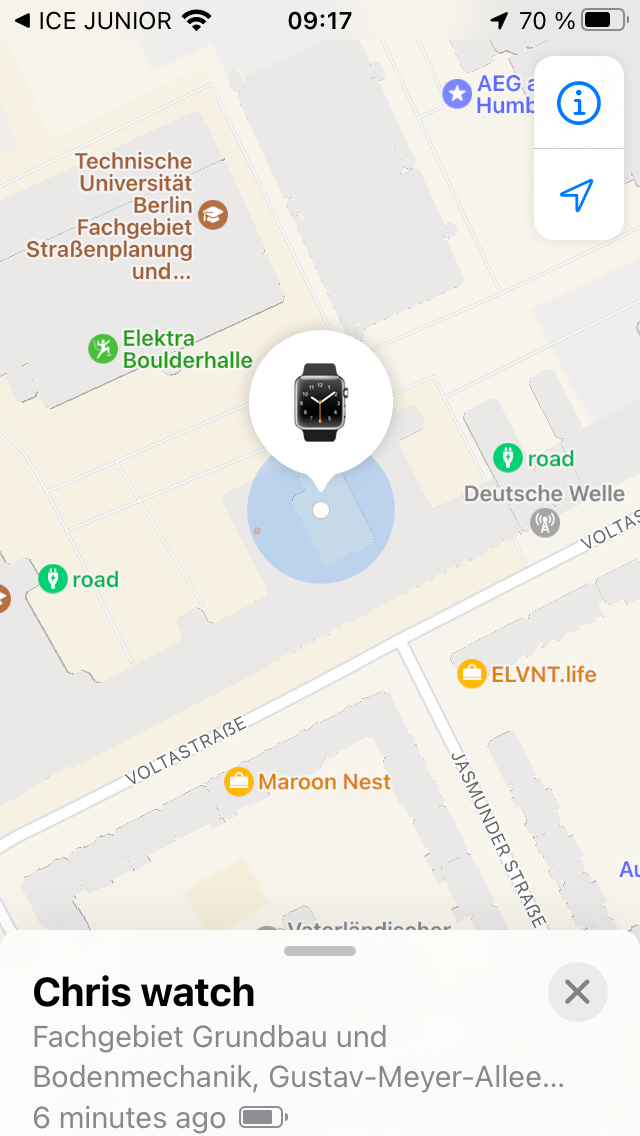 回到家后,iPhone 准确地更新了位置--从我们家移到了攀岩馆。但是,如果您的孩子所在的地方附近没有Apple 设备,追踪就无法进行。这正是 GPS 或 SIM 卡手表的优势所在。