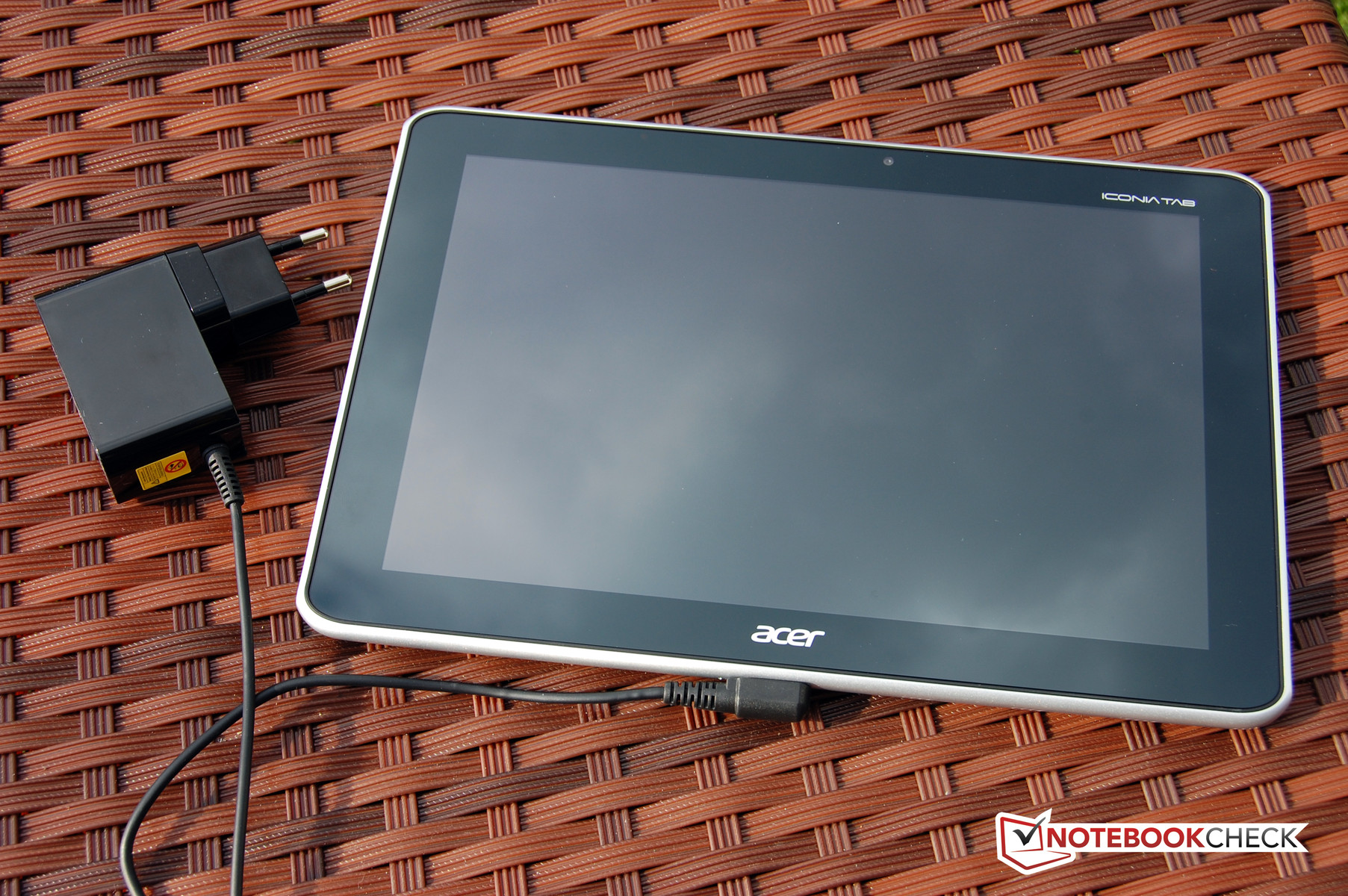 What is quite interesting with the Acer Tab is that the power cable, which plugs into the USB charging port, is angled so that it is not at a right angle to the lower housing frame, but rather parallel to it. This means that the risk of the cable accidentally breaking or being pulled out is minimized. Furthermore, this makes it a lot easier to use the tablet while it is charging – as long as the mains power is to the left of you.
