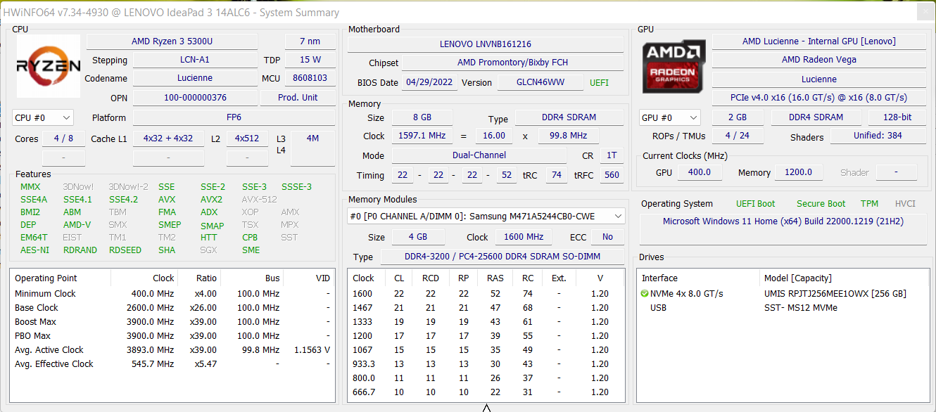 | Lenovo IdeaPad 3 14ALC6-82KT0077GE Vega 6, R3 5300U, Lenovo UMIS RPJTJ256MEE1OWX | Lenovo IdeaPad 3 14ITL6 82H700CCGE UHD Graphics Xe G4 48EUs, Celeron 6305, SK Hynix BC711 HFM128GD3HX015N | Lenovo IdeaPad 3 15ALC6 Vega 6, R3 5300U, Samsung PM991a MZALQ512HBLU | Acer Swift 3 SF314-43-R8BP Vega 7, R5 5500U, Kingston OM8PDP3512B-AI1 | Acer Chromebook 514 CB514-1WT-36DP UHD Graphics Xe G4 48EUs, i3-1115G4, SK Hynix BC711 HFM256GD3JX016N | Huawei MateBook D 14 (2021) Iris Xe G7 80EUs, i5-1135G7, Phison PS5013 311CD0512GB | |