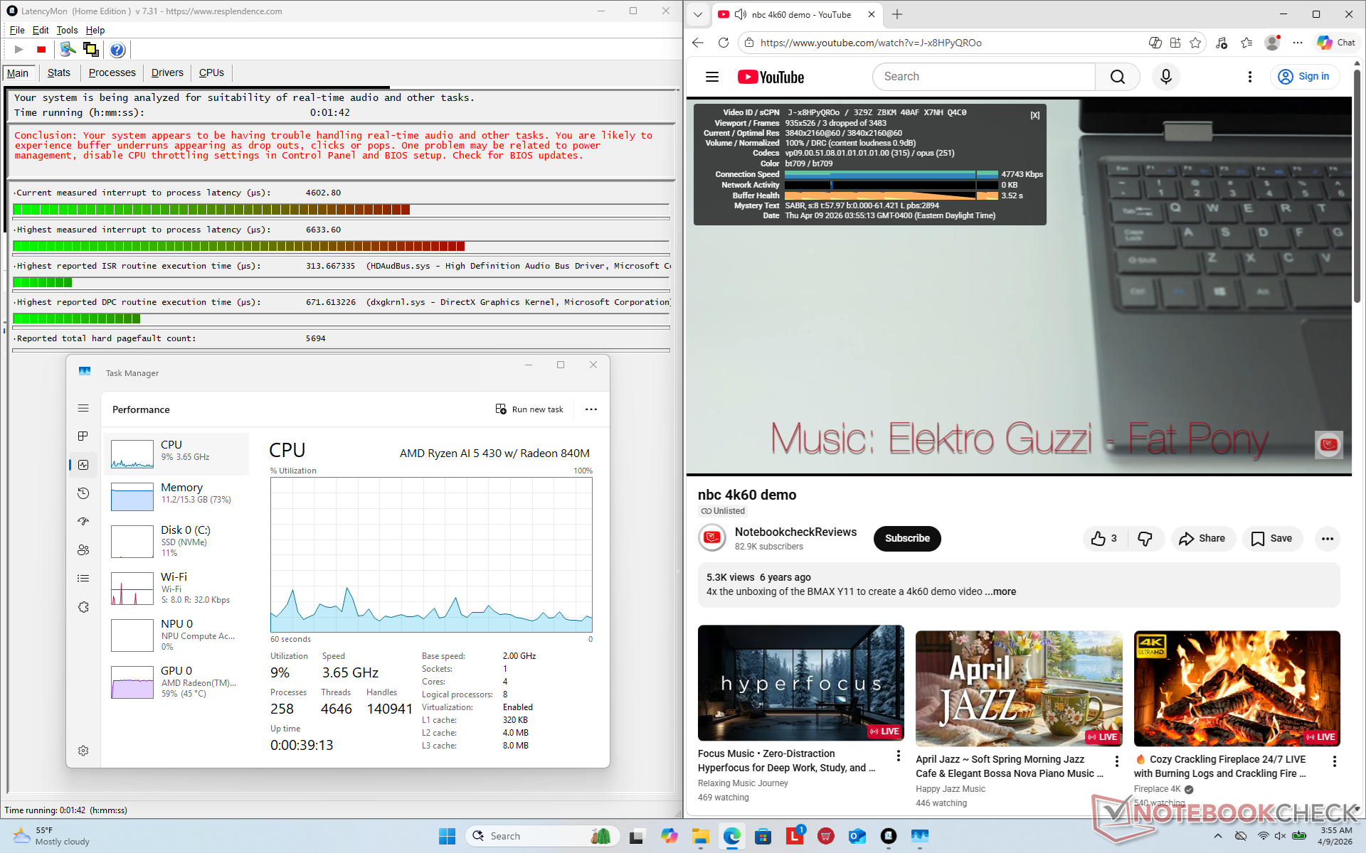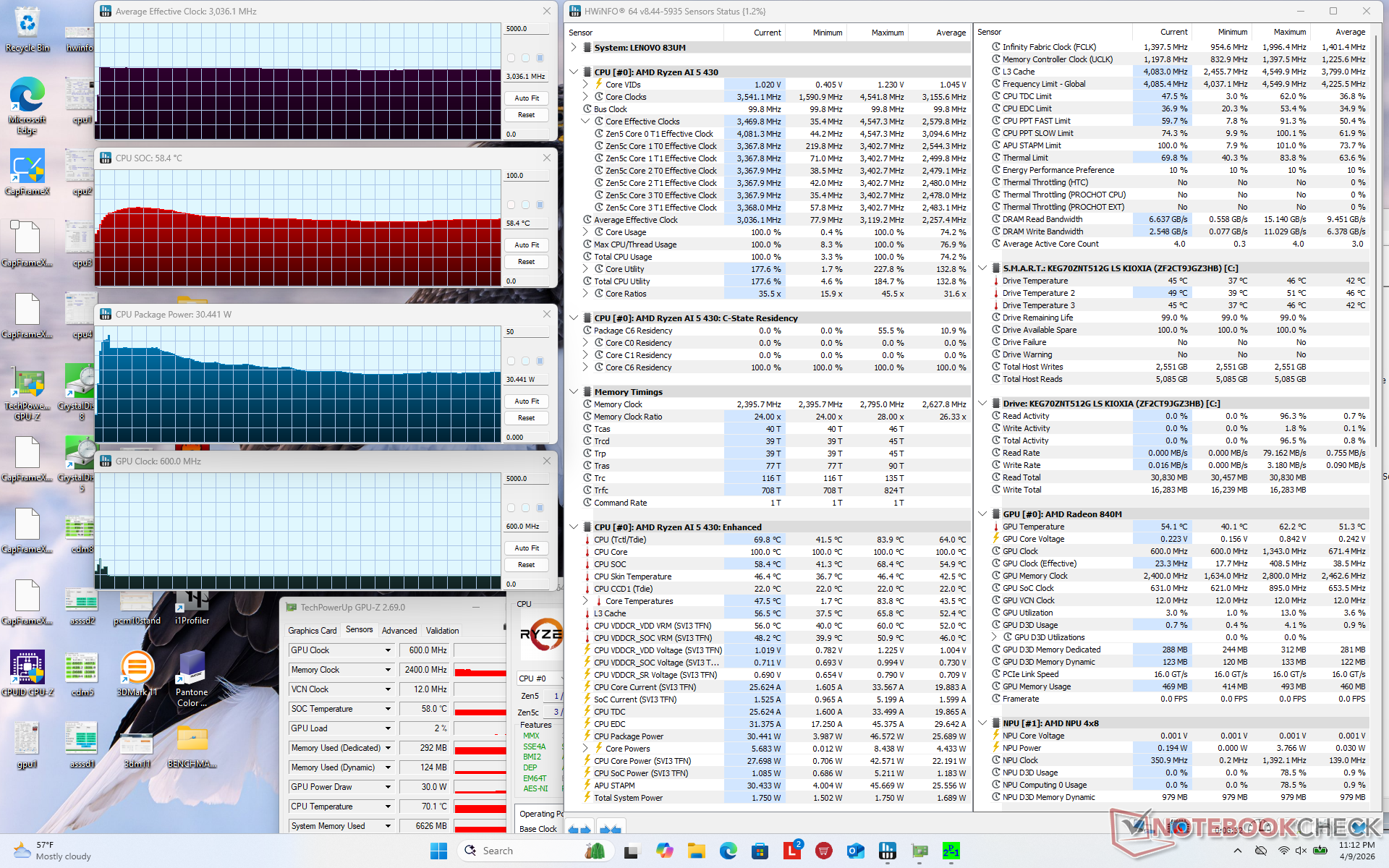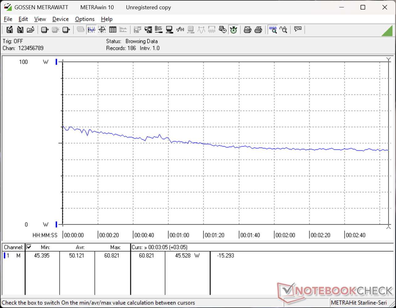 在运行 Prime95 压力测试时,处理器将稳定在 3 GHz、30 W 和 58 C。如下面的截图所示,CPU 封装功率只有在测试开始时才会高达 47 W。运行苛刻负载时的核心温度比我们在搭载英特尔处理器的 IdeaPad Slim 3 15IRH10R低约 10 摄氏度至 15 摄氏度。