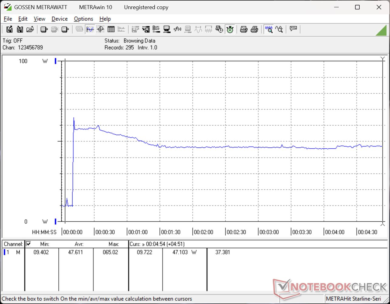 当 CPU 处于满负荷工作状态时,系统可以消耗小型(9 x 4.6 x 2.7 厘米)USB-C AC 适配器的全部 65 瓦输出功率,但如下图所示,这只是暂时的。