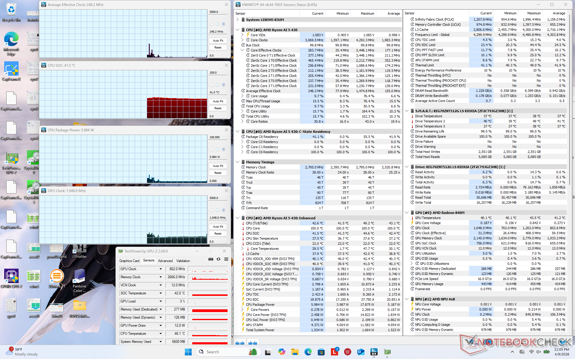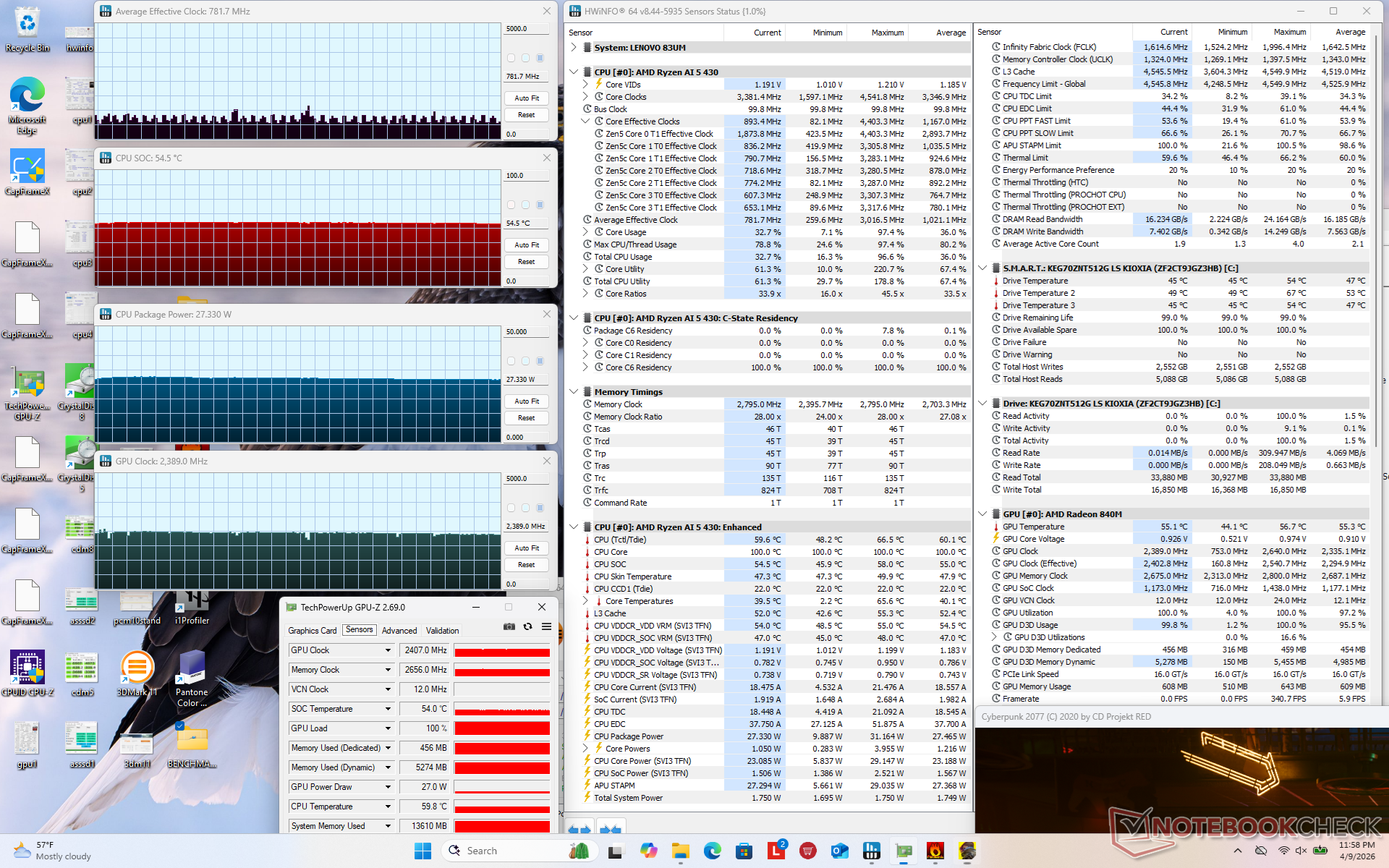 除了运行游戏时 AMD 系统的功耗至少要高出几瓦之外,其他时间的功耗与英特尔 IdeaPad Slim 3 15IRH10R 相近。在比较 Radeon 840M 和 Iris Xe 4 核时,略高的功耗与更快的集成 GPU 性能相吻合。