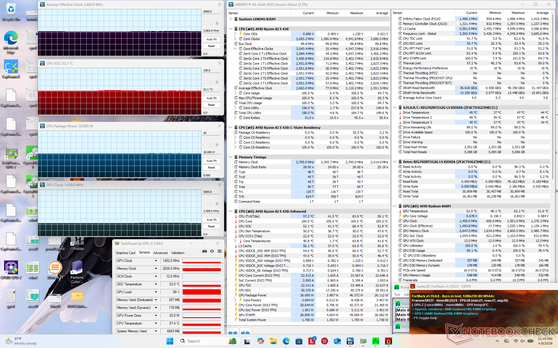 | Prime95 + FurMark Stress | 2.7 | 1459 | 52 |