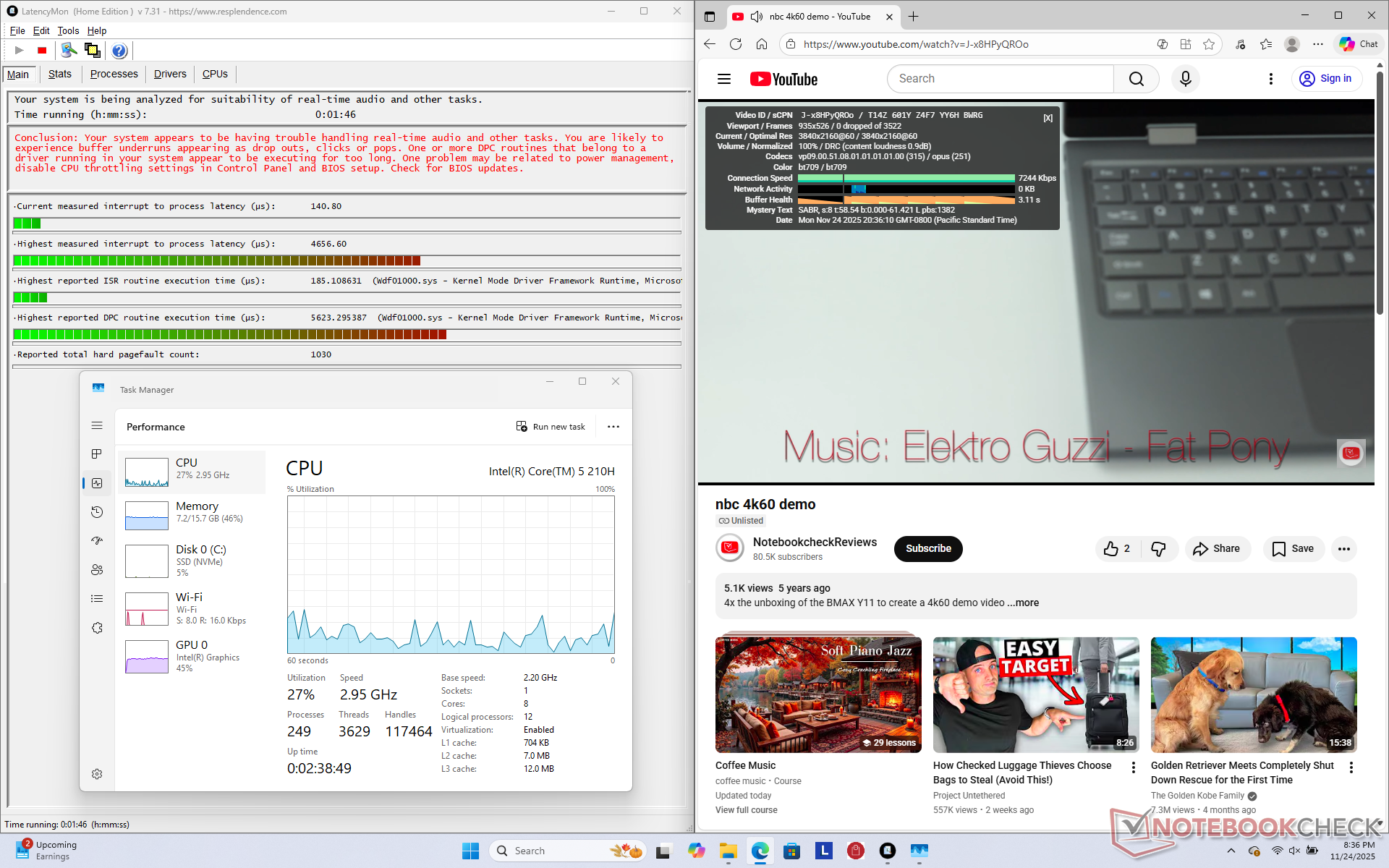 2025 联想 Ideapad Slim 5 16 有两种型号:AMD 或英特尔。在测试了 Ryzen AI 5 330和 酷睿 5 210H配置后,我们可以肯定地说,英特尔版本的多线程性能比 AMD 版本快 50%,游戏性能比 AMD 版本快 10% 至 30%,具体取决于游戏名称。运行苛刻负载时的功耗总体较高,因此每瓦性能并不一定比 AMD 高多少,但两者的 WLAN 电池续航时间相当接近。