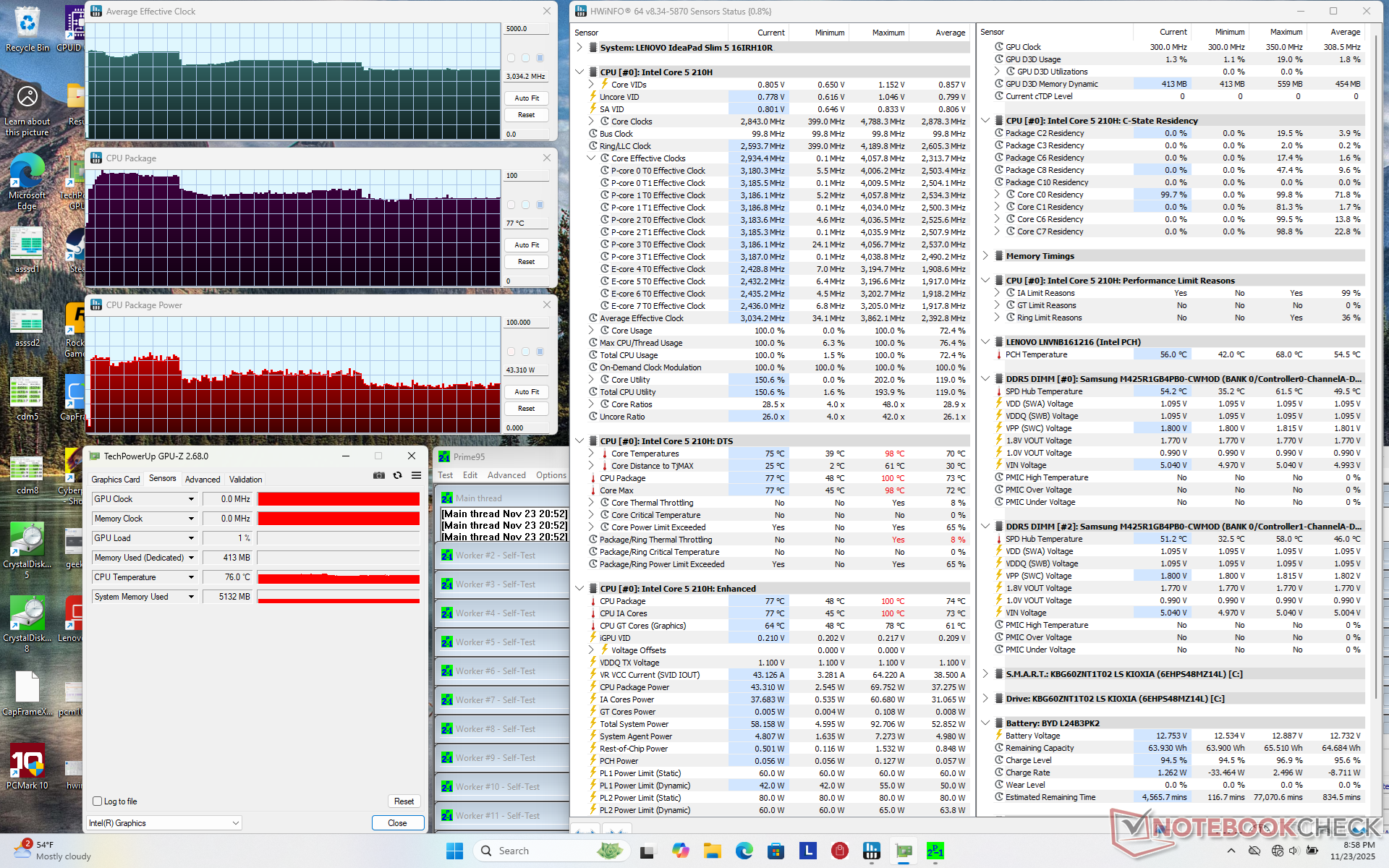 | Prime95 + FurMark Stress | 2.1 | 1350 | 76 |
