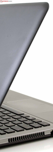 This does not diminish the practicality. In order to enhance the book resemblance and the lateral grip, the edges are curved inwards. This also eases opening the lid. The top and bottom sides look identical (no maintenance cover, perfectly flat surface) and are both made of lacquered aluminium panels.